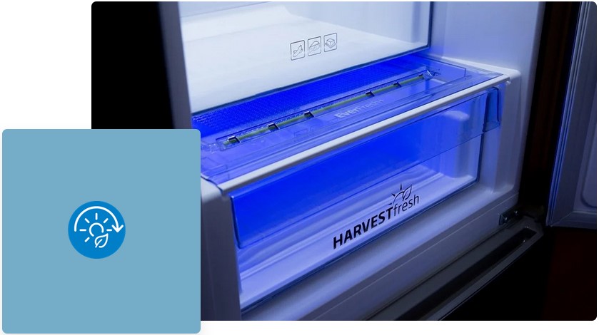 Это инновационная технология из 3 цветов, благодаря которой мы можем дольше держать витамины A и C в хранимых овощах и фруктах дольше. Благодаря этому наши продукты останутся свежими дольше. В специальном ящике Harvestfresh 24-часовой солнечный цикл подражают свету в синем, зеленых и красных.