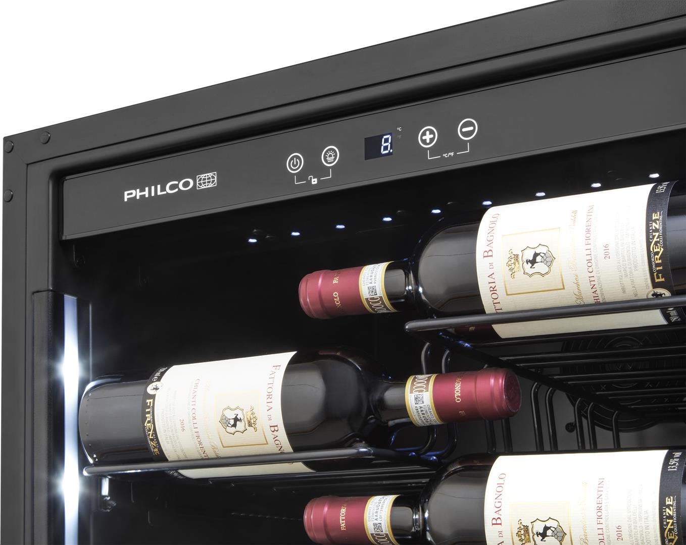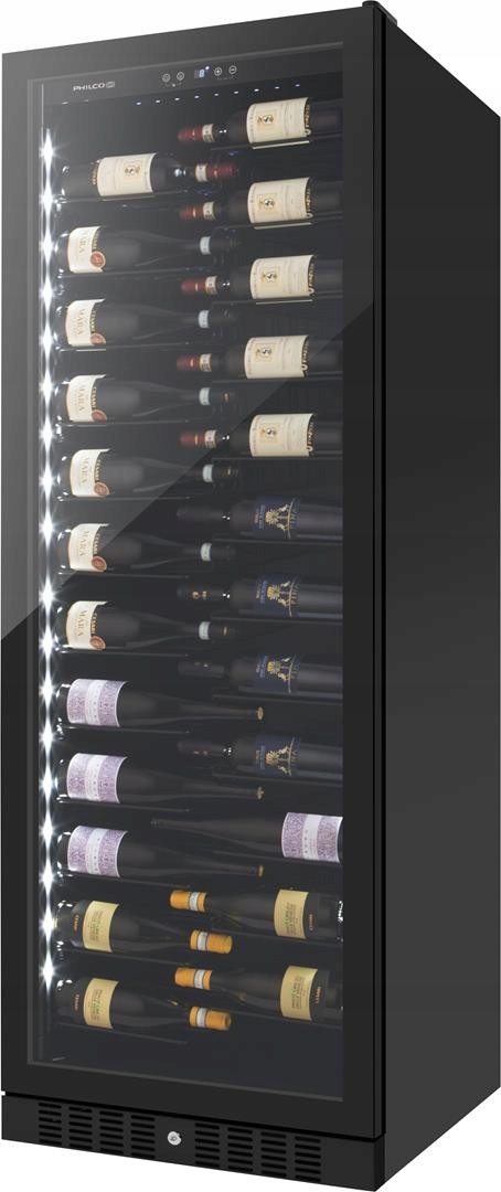 Philco PW143GLV однозонный компрессорный винный холодильник с сенсорным управлением на 143 бутылки, с включенной системой Label View металлические полки с телескопическими направляющими и функцией Softclose, благодаря которой вы можете видеть, где находится ваше вино, не открывая дверцу. Винный погреб оборудован тройной стеклянной дверью с защитой от ультрафиолета и специально хранящимся компрессором, снижающим вибрацию. Дверь винного погреба оборудована замком.