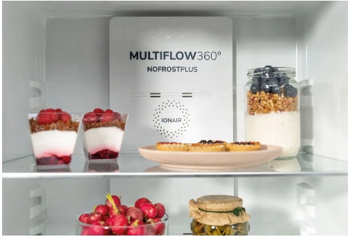 IonAir производит отрицательно заряженные ионы внутри устройства, которые равномерно распределяются по всему холодильнику отсек благодаря системе MultiFlow 360°. Обогащенный таким образом воздух сохраняет свой вкус и удаляет неприятные запахи.