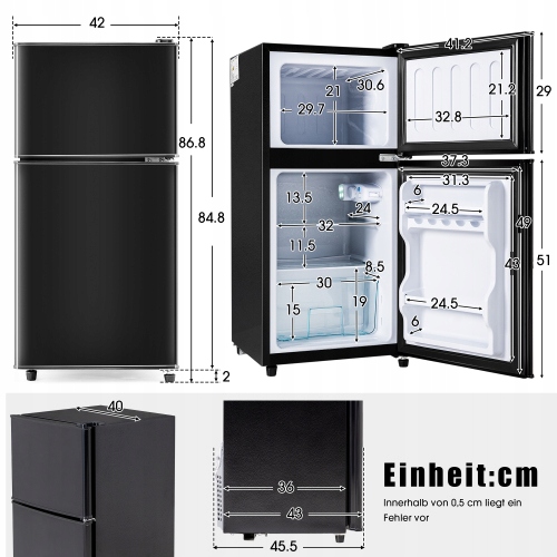 Этот двухдверный холодильник имеет компактный и стильный дизайн, который придает современный характер и отвечает различным потребностям. Компактный и отдельно стоящий, этот черный двухдверный холодильник может служить запасным холодильником для напитков и закусок в гостиной, на кухне или рядом с диваном. Объем салона составляет 82 литра, он оснащен светодиодной лампой для антибликового освещения.