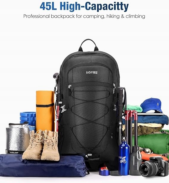 - 【Большая емкость】 Этот 45-литровый туристический рюкзак с большим основным отсеком и внешними функциональными карманами обеспечивает достаточно места для хранения необходимого оборудования. Аксессуары для повседневных потребностей, таких как палатка, увлажненные салфетки, спальный мешок, туристические палочки, одежда, обувь для лазания, зонт, iPad, MacBook, кружка, шампунь, зубная щетка, лиц, мытья жидкость, комплект первой помощи, веревка, еда и т. Д. Li>