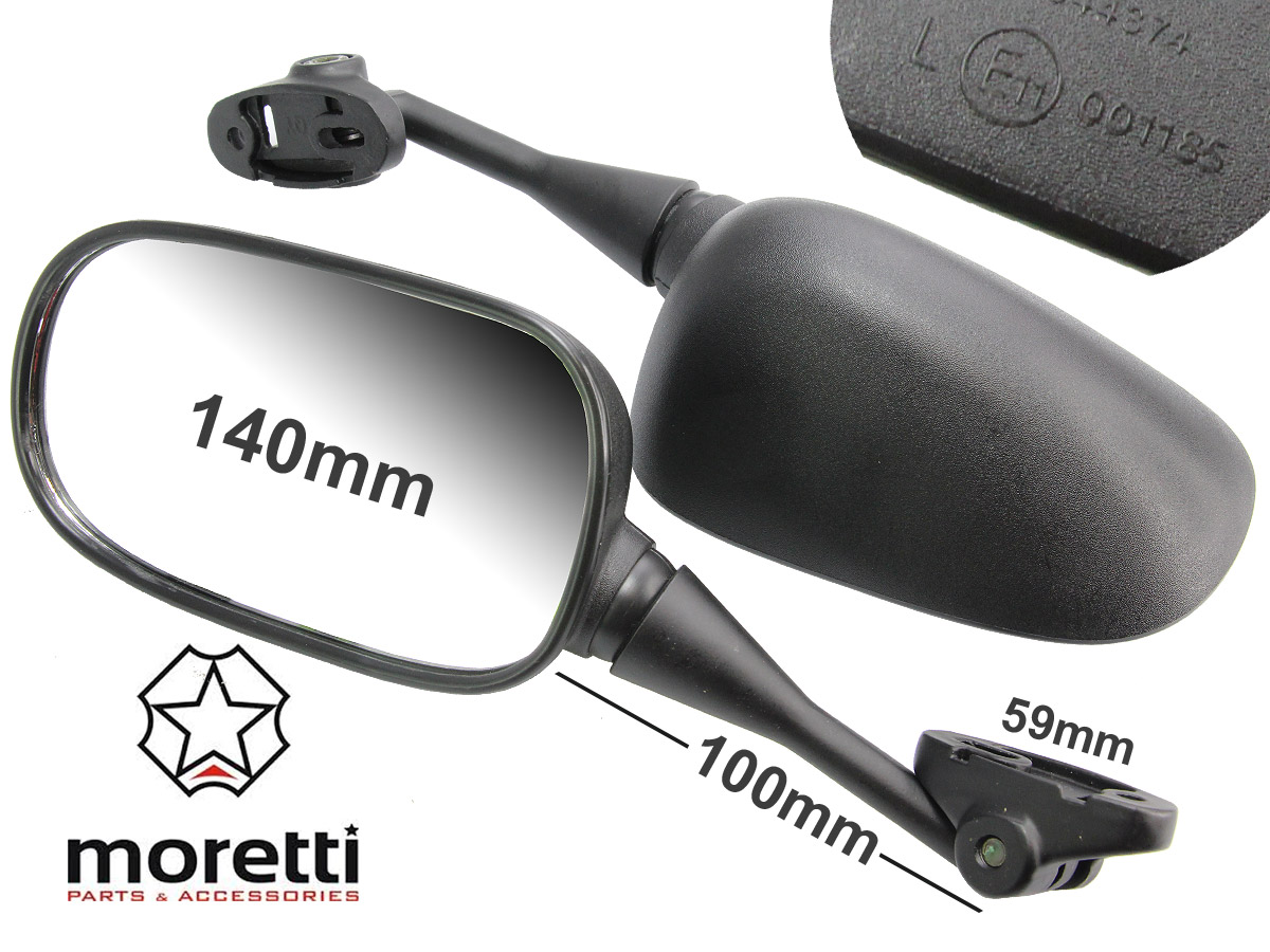 Черные матовые зеркала с прямоугольной формой. Монтируется на сплошной металлической ручке для обтекания с интервалом винтов от 20 мм до 40 мм. У них есть возможность сформулированной настройки угла просмотра, благодаря которой можно индивидуально отрегулировать настройки к вашим потребностям. Они оснащены отверстиями для дренажа воды.