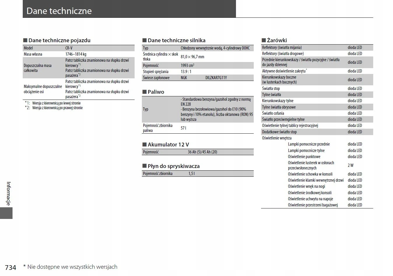 Руководство для владельца Honda содержит все версии оборудования и полезную информацию о том, как эффективно и безопасно использовать автомобиль, например: - индикаторы, контрольные лампы, открывание и закрывание - освещение и обзорность, сиденья, отсеки для хранения вещей, отопление, вентиляция, кондиционирование воздуха. - советы по вождению, эксплуатации, обслуживанию автомобиля - уровни жидкостей, проверка и доливка, аварийные операции, замена колес, предохранителей, замена лампочек - технические данные... и многое другое, дающее путешественникам ощущение безопасности и комфорта. Польское законодательство обязывает продавца приложить к автомобилю руководство по эксплуатации на польском языке. Руководство пользователя автомобиля новое, на польском языке.