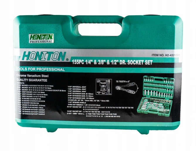 Оригинальный набор торцевых ключей HONITON. Очень качественные головки из хромванадиевой стали, что гарантирует их высокую долговечность! В наборе 155 розеток, все упакованы в практичный чемодан.