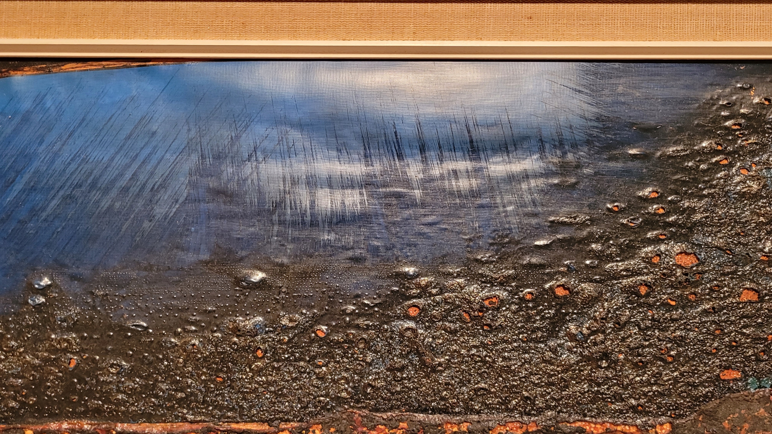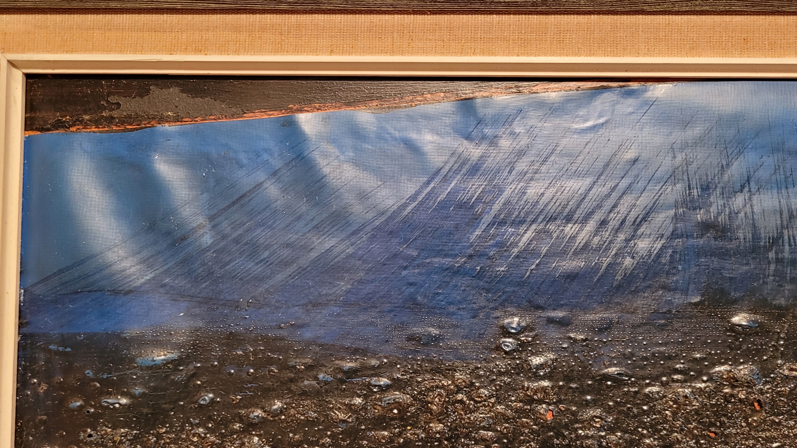 - Вверху часть под работой видны пузыри от воздуха (синие и красные фрагменты картины - фото).