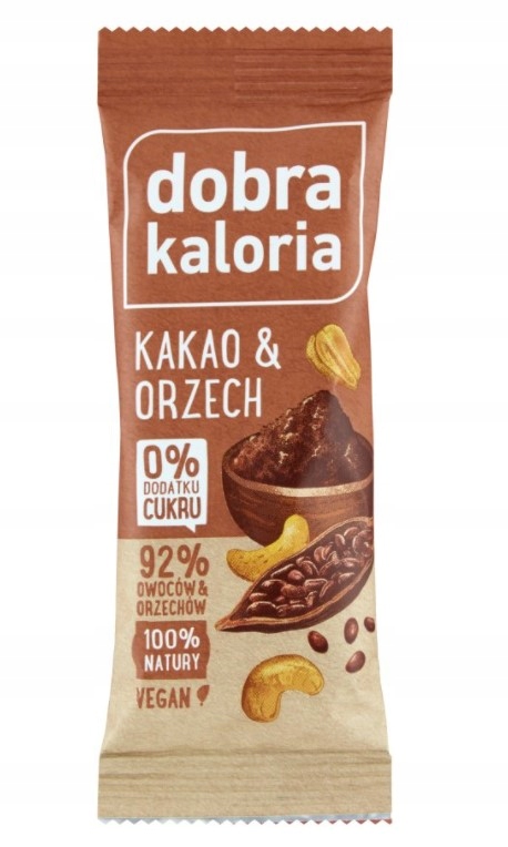 Добра Калория Фруктовый батончик, какао и орех Фруктовый батончик, какао и орех. Простой, сытный, вызывающий сильное привыкание. Сладкая и ореховая закуска для активных людей. Содержит только природные сахара. Орехи кешью являются богатым источником белка, кальция, магния, цинка и мононенасыщенных жирных кислот (гамма-линоленовой кислоты). Всего одна горстка орехов в день покрывает суточную потребность в марганце и меди! Орехи кешью помогают предотвратить сердечно-сосудистые заболевания благодаря содержанию вышеупомянутых ненасыщенных жирных кислот. Высокое содержание магния в орехах благотворно влияет на правильное функционирование сердечной мышцы. Добавление какао обогащает батончик полифенолами, флавоноидами и антиоксидантами, которые помогают удалять свободные радикалы кислорода, повреждающие клетки организма. Более того, он придает глубокий шоколадный вкус!