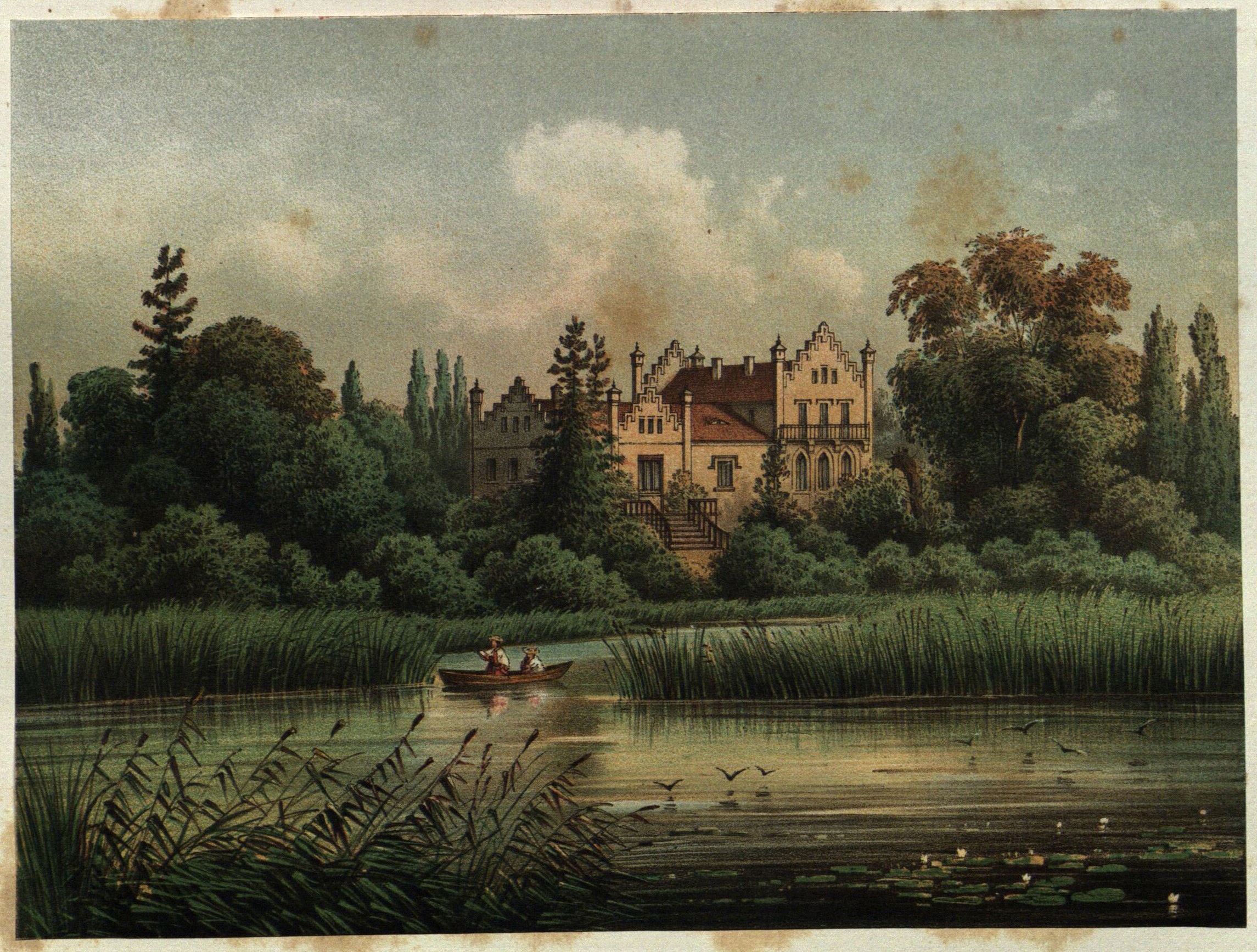 Чарчице (Мендзиход повят). Дворец, от: ДУНКЕР Александр (редактор и издатель), Die ländlischen Wohnsitze, Schlösser und Residenzen..., Берлин 1857–1883, хромолит. оклеена бумагой (пятна и следы от скрепки на листе), оригинальная карточка с описанием прилагается, размеры: вид: примерно 198x148 мм; произношение лист: примерно 388x290 мм. Провинция Позен - Региерунгс - Безирк Позен - Крайс Бирнбаум. Борзые.