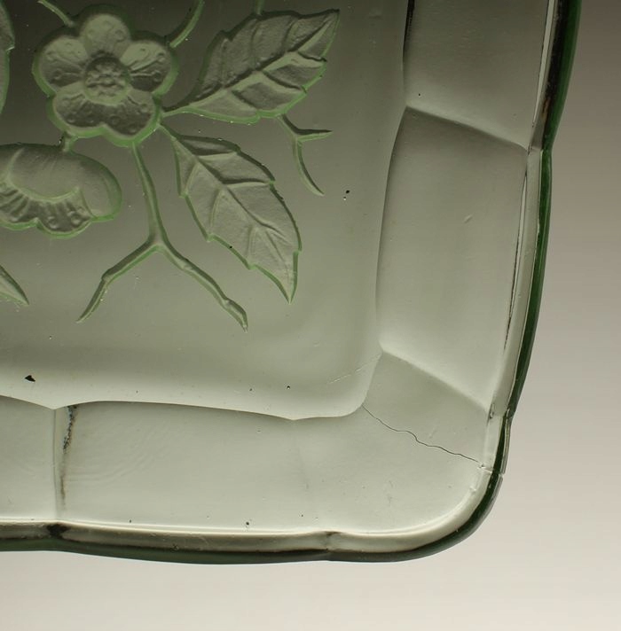 Прямоугольный поднос из прессованного стекла ураново-зеленого цвета. Поверхность основы украшена матовым мотивом цветов и фруктов. Произведено на Хозяйственном стекольном заводе «Гортензия» в Петркуве-Трыбунальском. В каталоге 1936 года. лоток номер 20.
