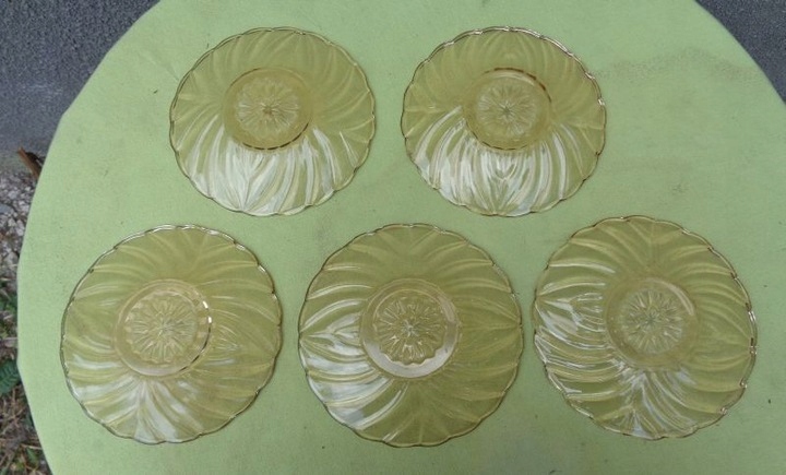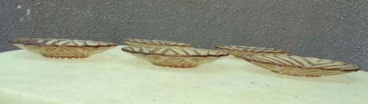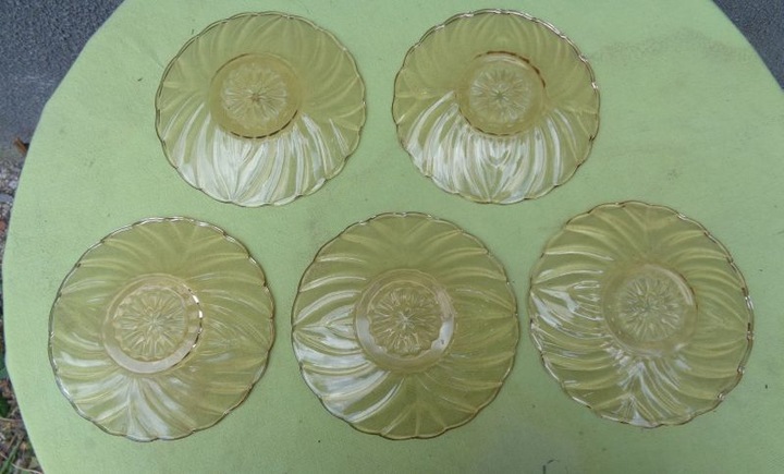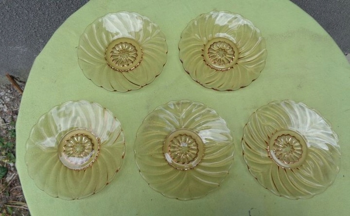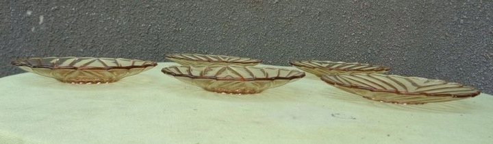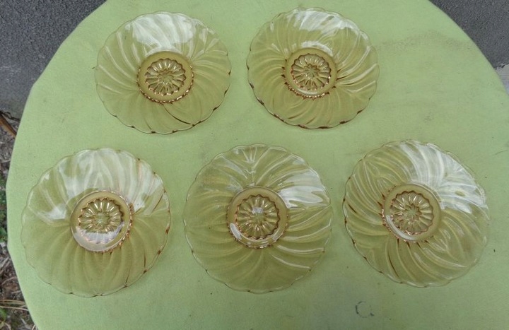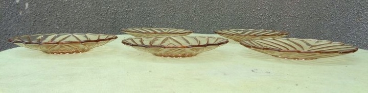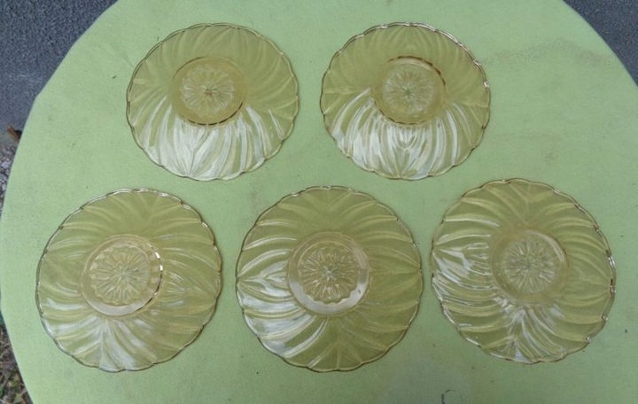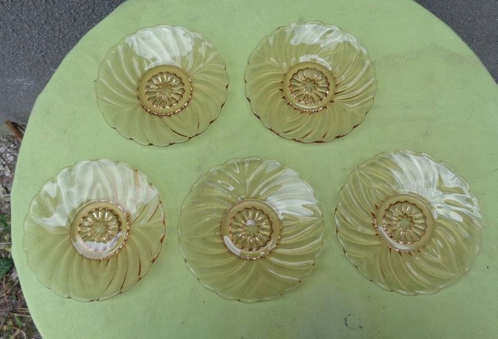 Красивые, элегантные, каталожные тарелки, пять штук, изготовленные на стекольном заводе «Гортензия», 1900-1920 гг. Каталожный номер у них 428. Тарелки выполнены из красивого стекла медового цвета. Низ тарелок украшен красивой розеткой. Край экспонатов имеет волнистый контур. Стакан украшен красивым разнообразным орнаментом. Тарелки б/у и имеют следы использования. Стекло не имеет трещин и повреждений. Всем рекомендую.