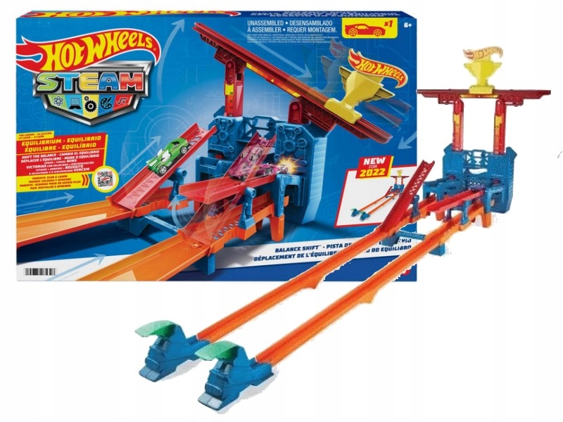 Игровой набор Hot Wheels® STEAM Balance Shift™ помогает детям понять науку о балансе посредством веселья и соревнований, когда они используют ударную пусковую установку, чтобы поднять свои машины вверх и через качели, чтобы заполучить трофей.