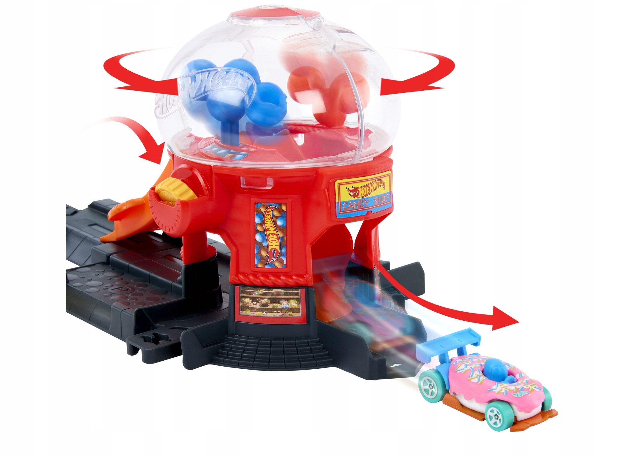 ► Проезжайте по трассе внутри автомата с жевательной резинкой, затем нажмите кнопку, чтобы запустить шарики, похожие на жевательную резинку, и наблюдайте, как машина скользит по трассе. вниз по пандусу!