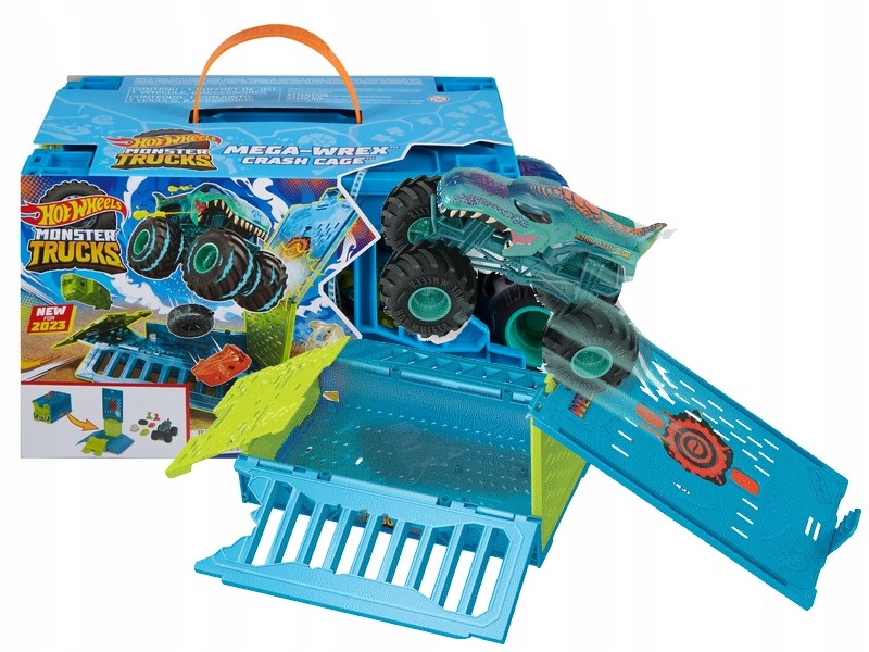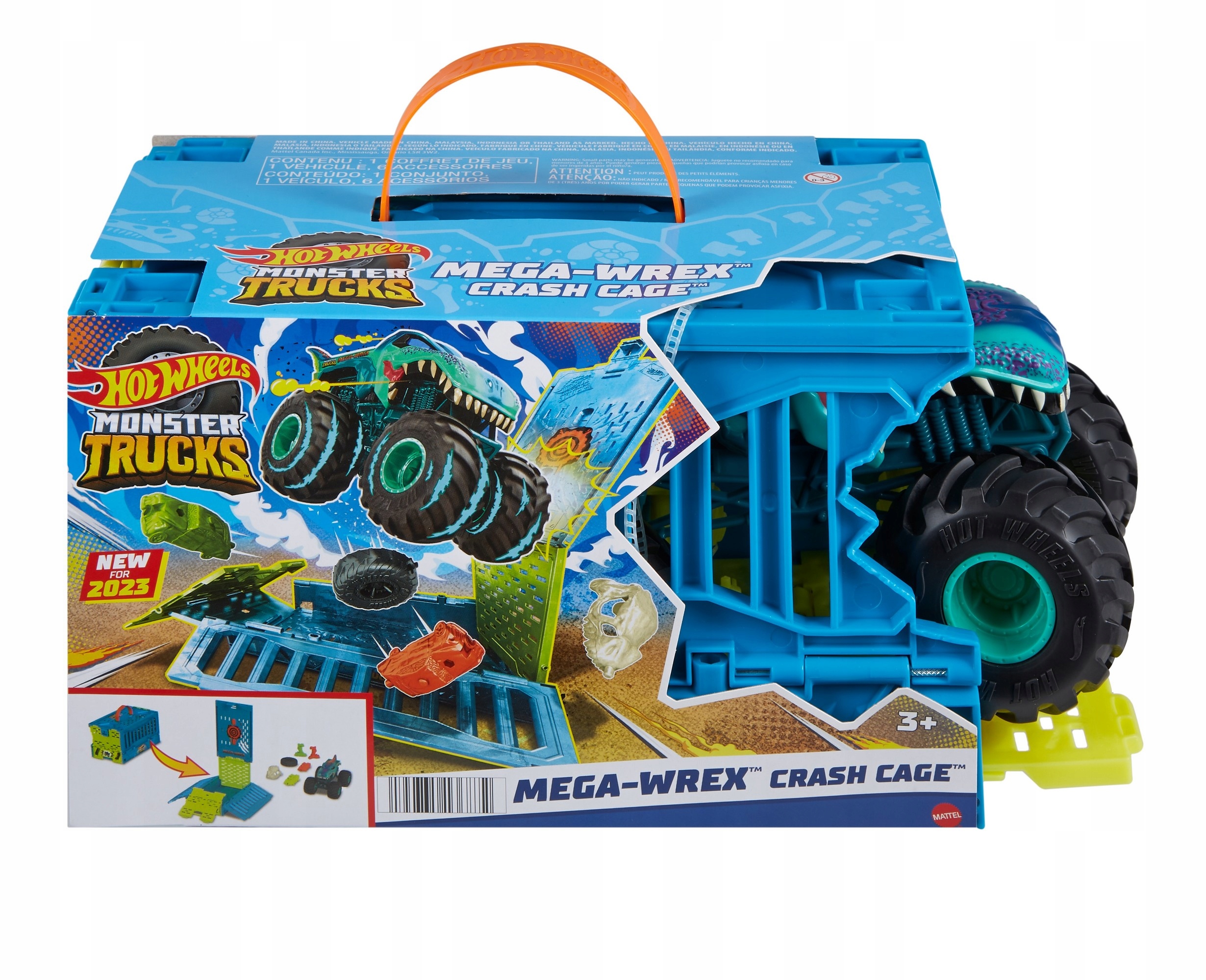 Открывается негабаритная аварийная клетка Hot Wheels Monster Trucks 1:24 Mega-Wrex чтобы открыть удивительную игровую среду с трамплинами, целевыми зонами и уникальным огромным Мега-Рексом.