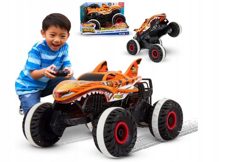 Дышите по любой местности с дистанционно управляемым грузовиком Hot Wheels® Monster Trucks Unstoppable Tiger Shark.