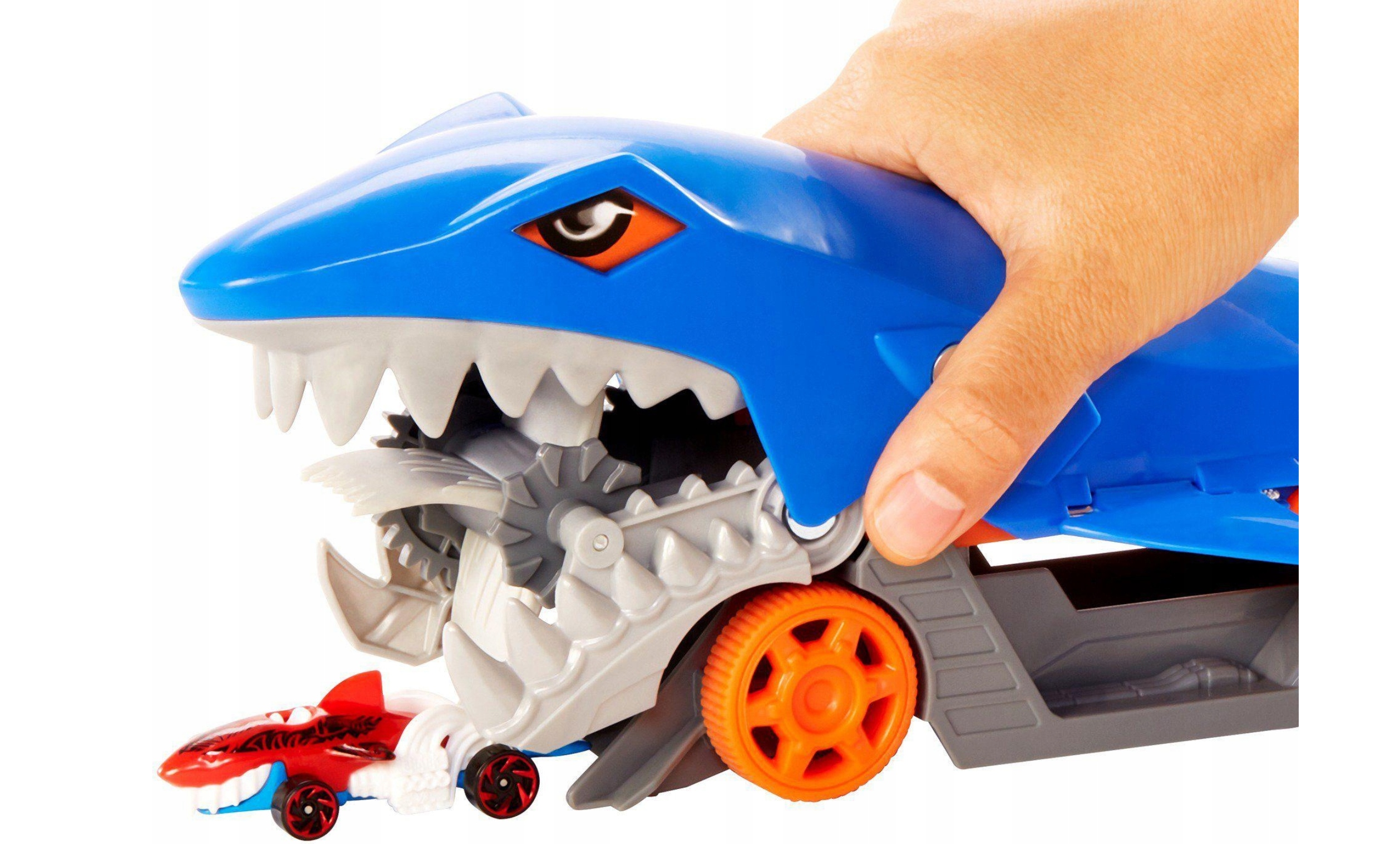 ► Голодная акула поедает машинки Hot Wheels™ и хранит их в своем «брюхе», что делает транспортировку и игру еще более увлекательными!