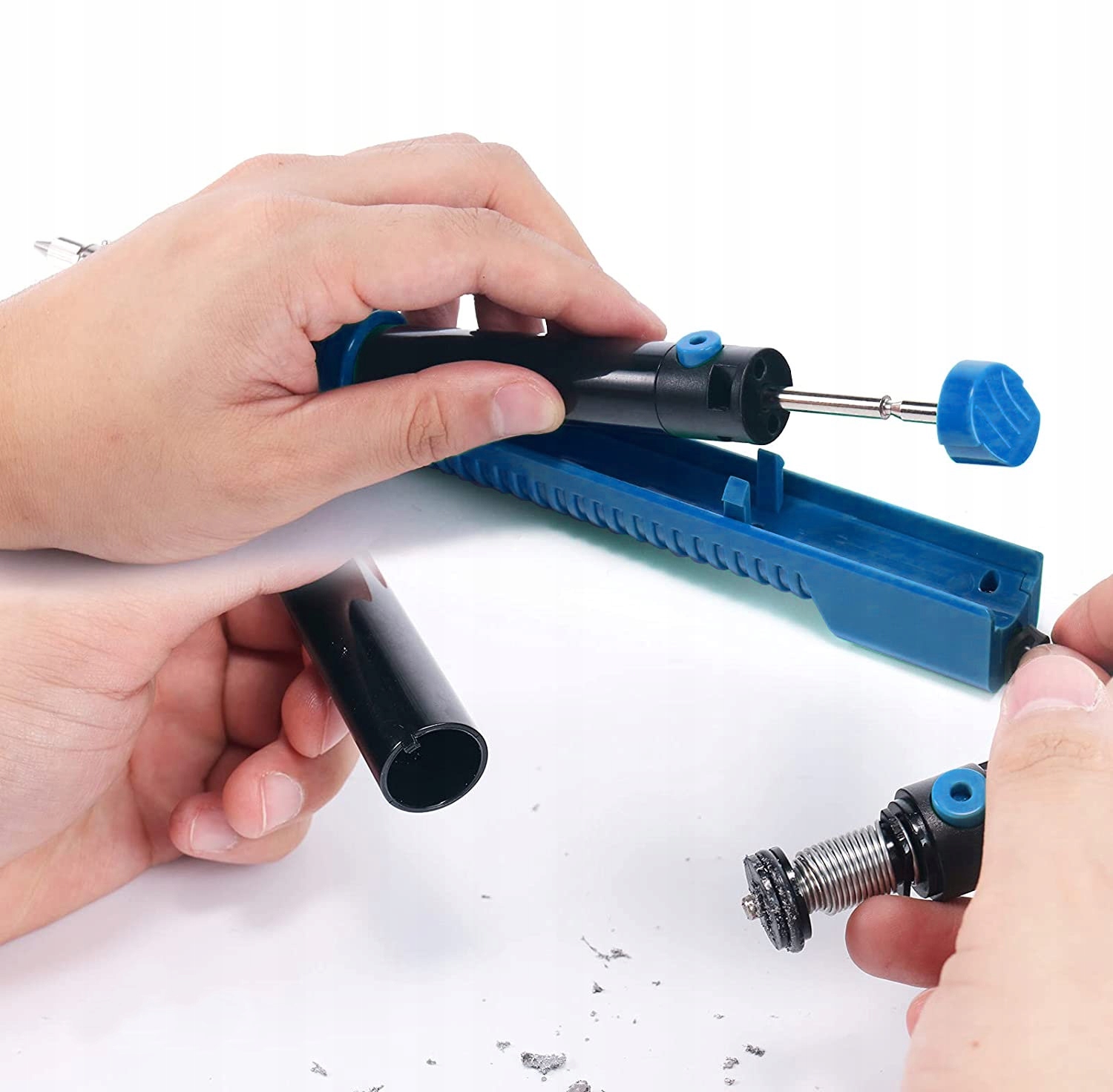 Электрическое всасываниеeдляжести с шомполом и дополнительной насадкой. Электрический пылесос используется для удаления связующего припоя, такого как олово. Аспиратор быстро нагревается до рабочей температуры. Конструкция вытяжки эргономична, что делает работу комфортной и эргономичной. Имеет световой индикатор работы. В комплект входит шомпол для быстрой чистки и одно запасное лезвие.