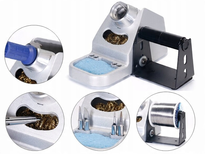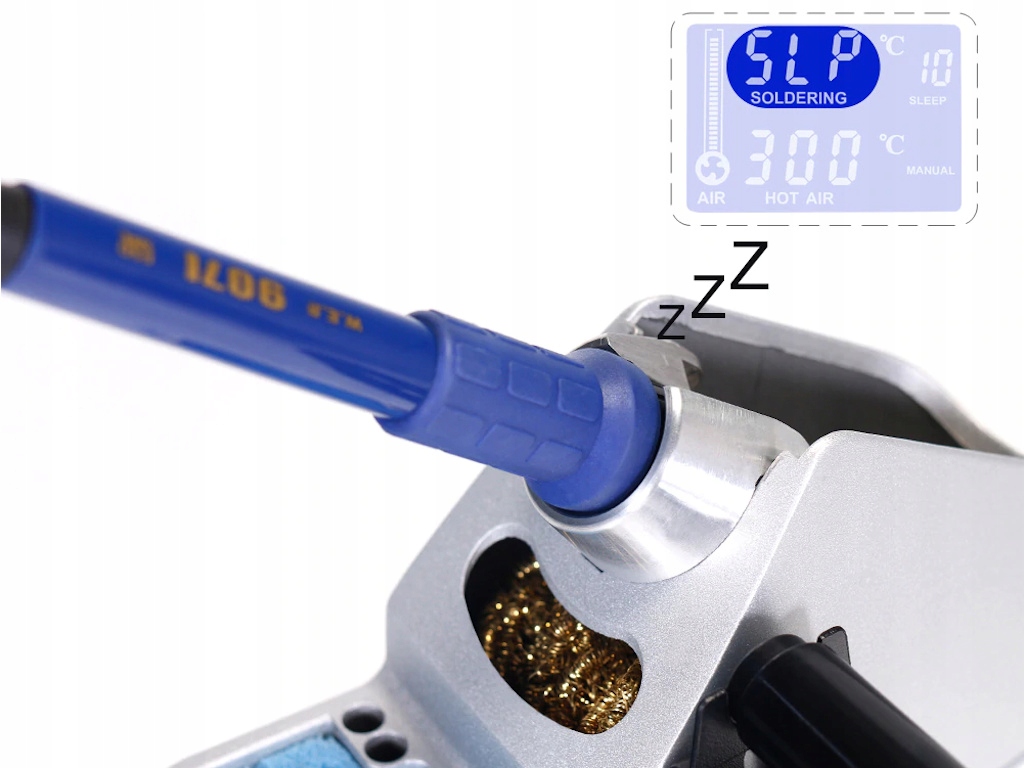Держатель термовоздушной колбы имеет в нем размещен датчик, который при откладывании колбы в сторону переводит ее в режим ожидания путем охлаждения нагревательного элемента и последующего отключения потока воздуха. Это продлевает срок службы обогревателя и экономит электроэнергию.