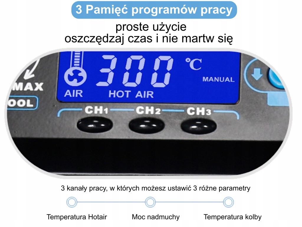 3 программы работы. Паяльная станция может запомнить 3 программы работы для горячего воздуха и утюга. В зависимости от вида монтажно-демонтажных работ устанавливаем соответствующую программу