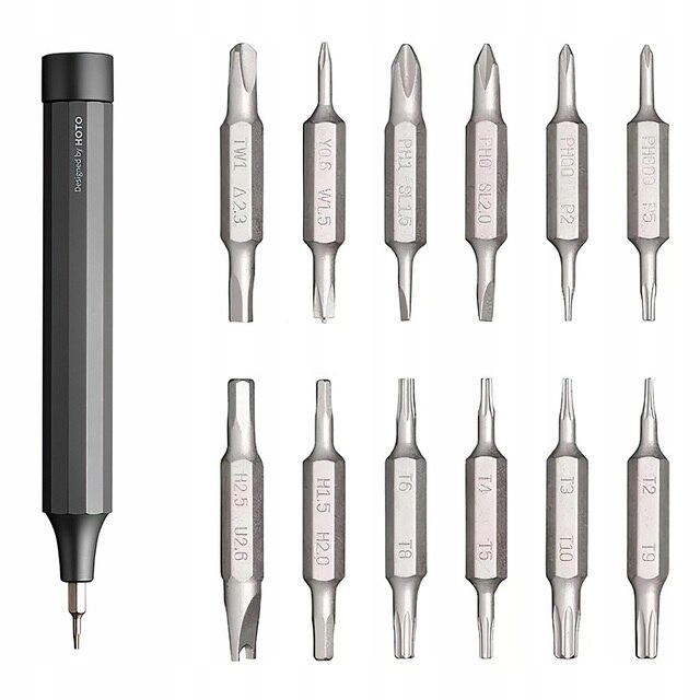 В наборе 12 двусторонних бит 24 самых популярных видов. Они характеризуются твердостью до 60HRC и изготавливаются из высококачественной стали S2. Поэтому они долговечны и устойчивы к механическим повреждениям, износу и ржавчине. Они идеально подходят для ремонта часов, ноутбуков, игрушек, игровых приставок, дронов и многих других устройств.