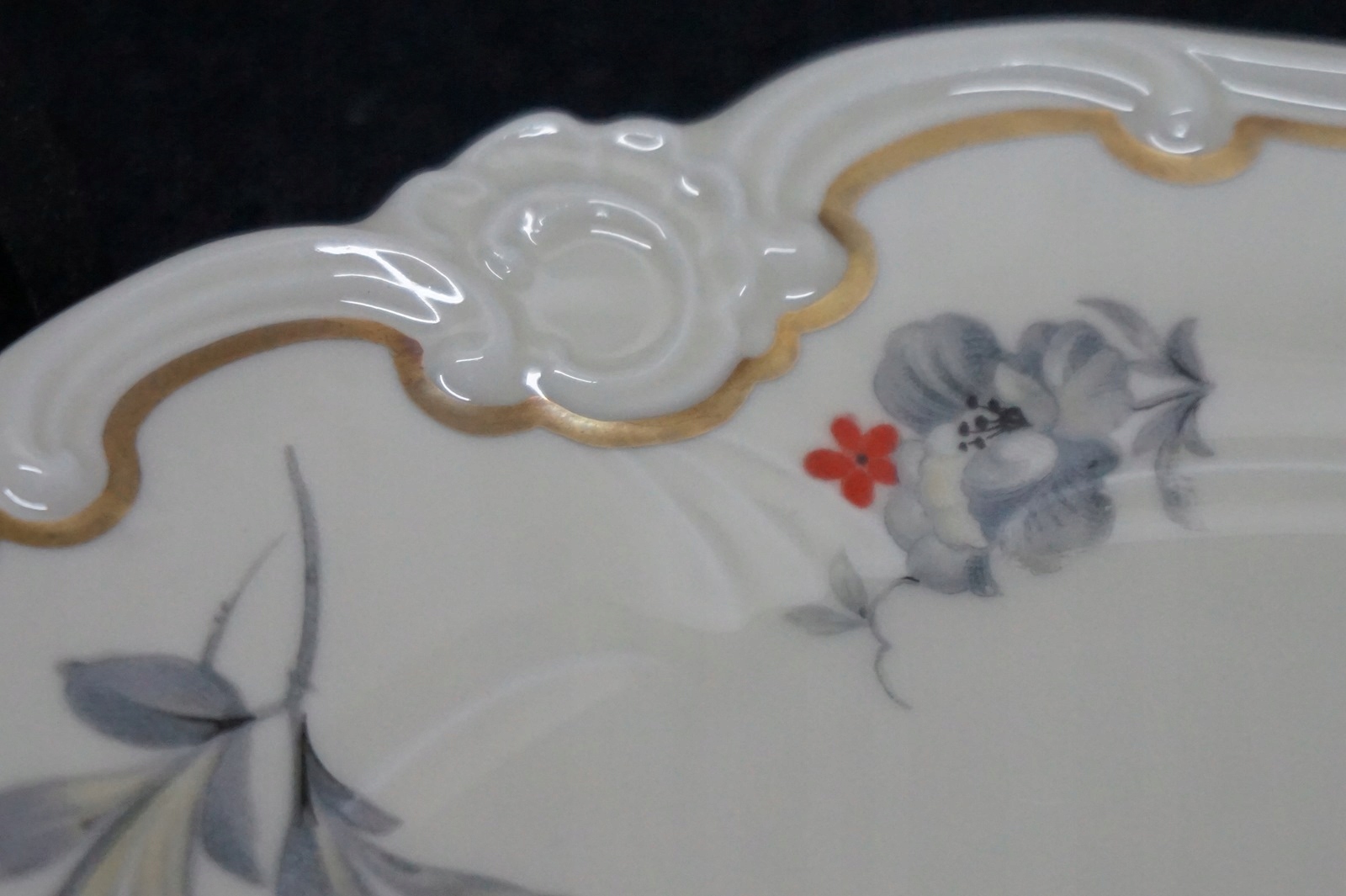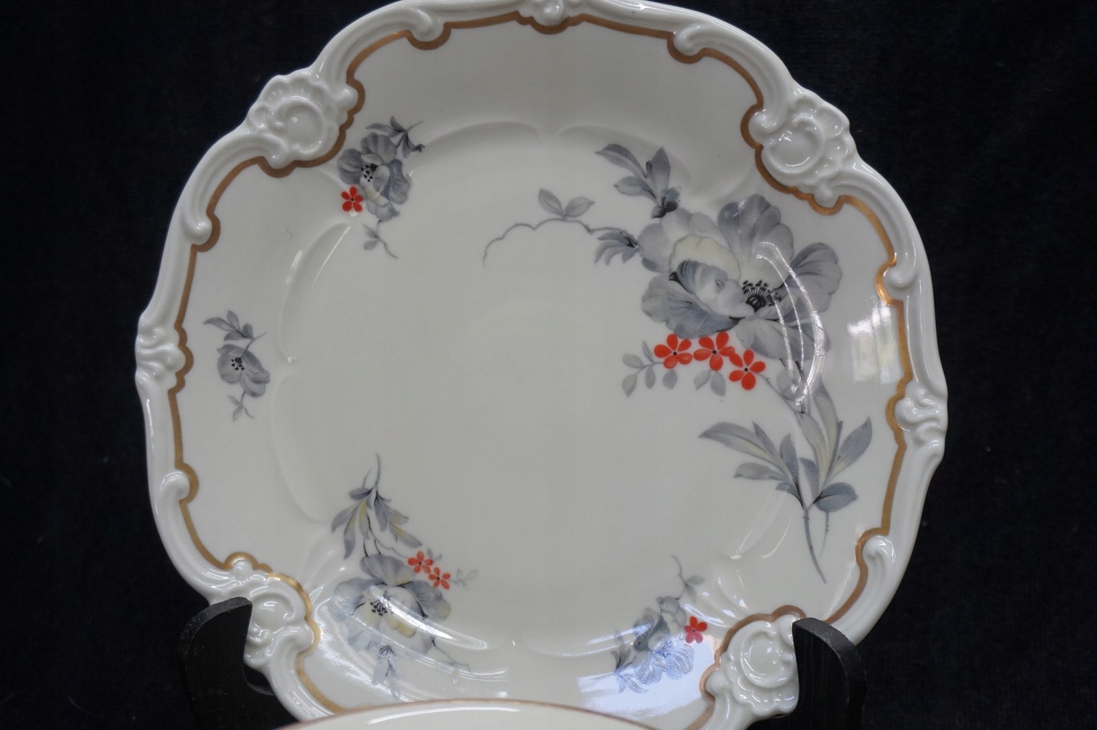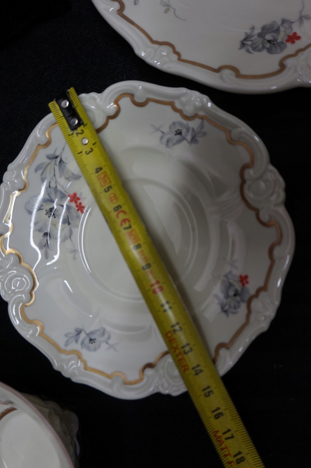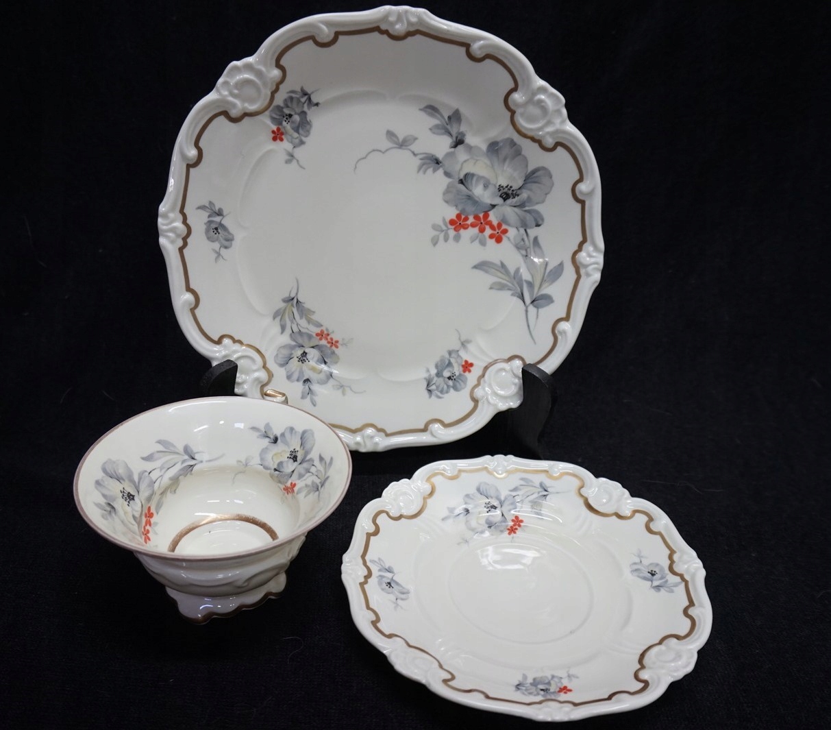 Фарфор белого и кремового цвета, позолоченный, богато украшенный цветочным мотивом.