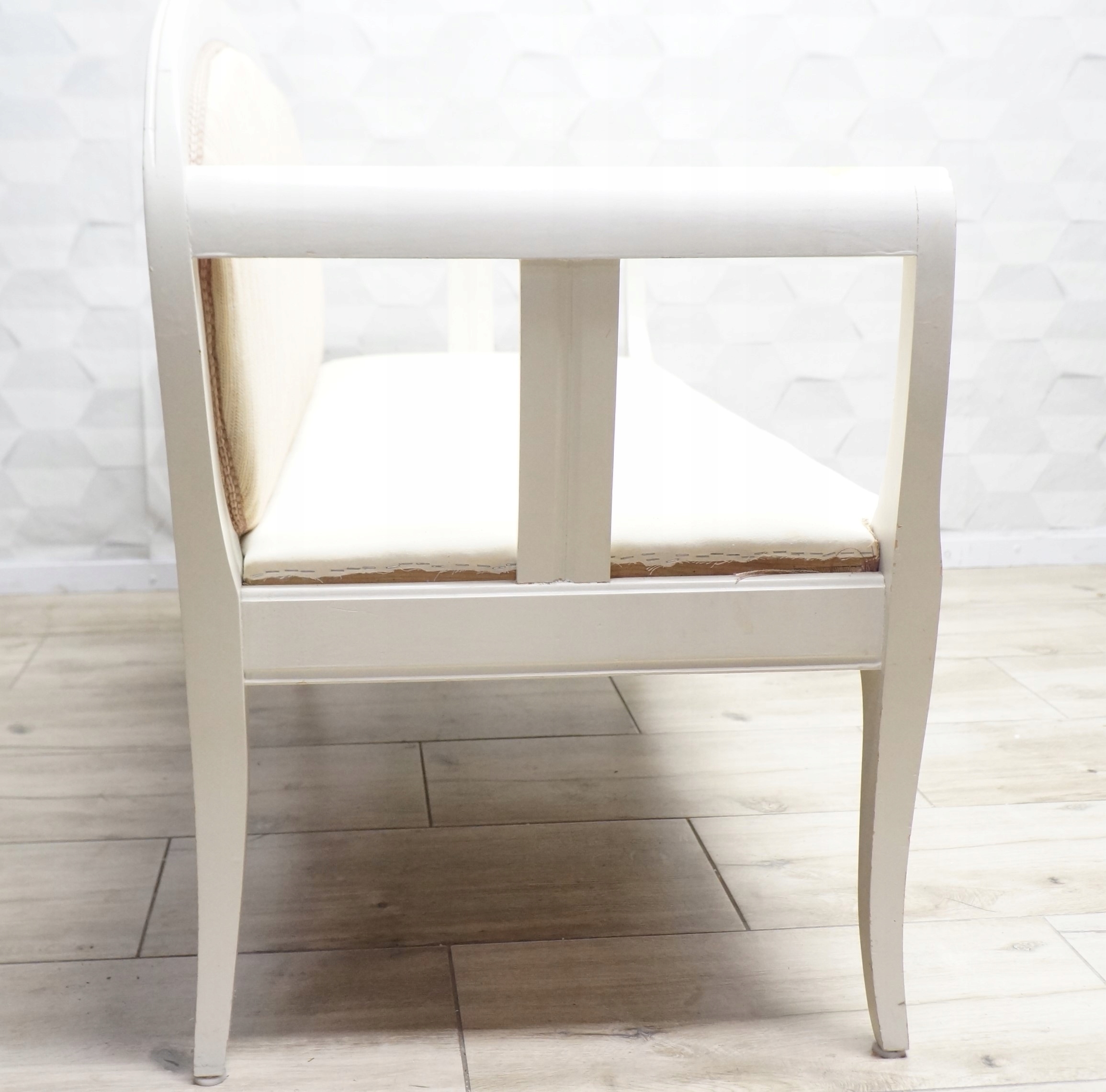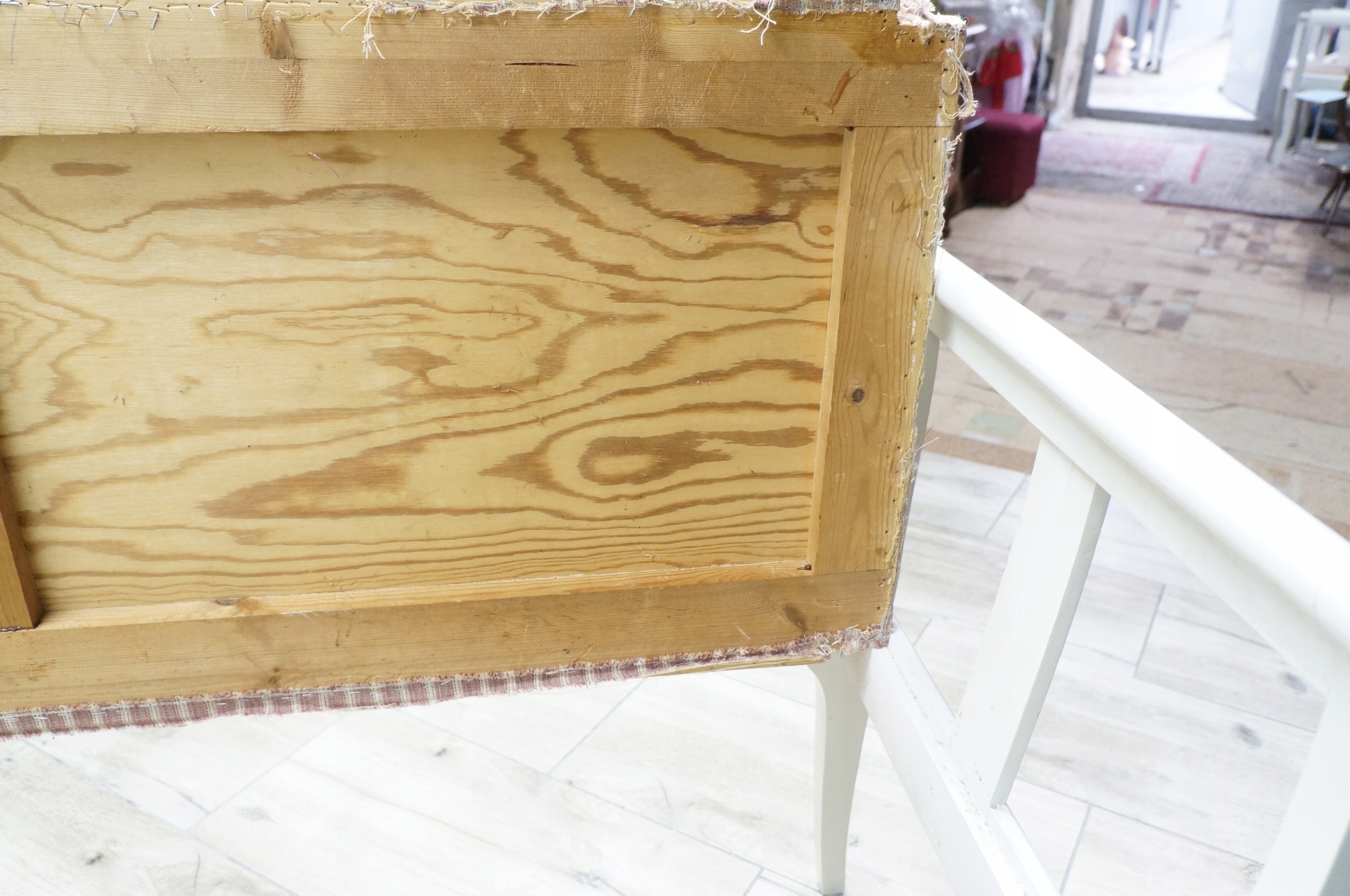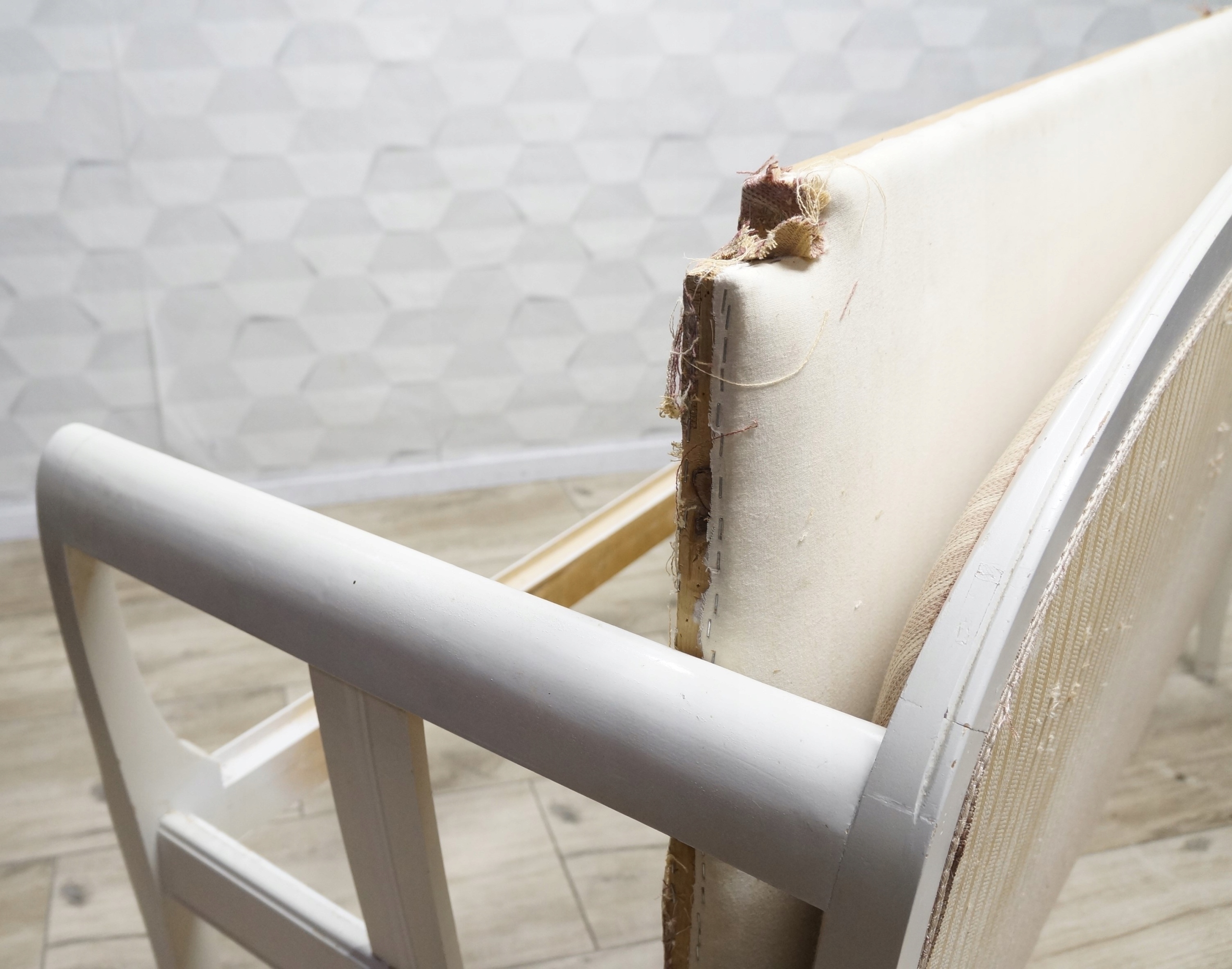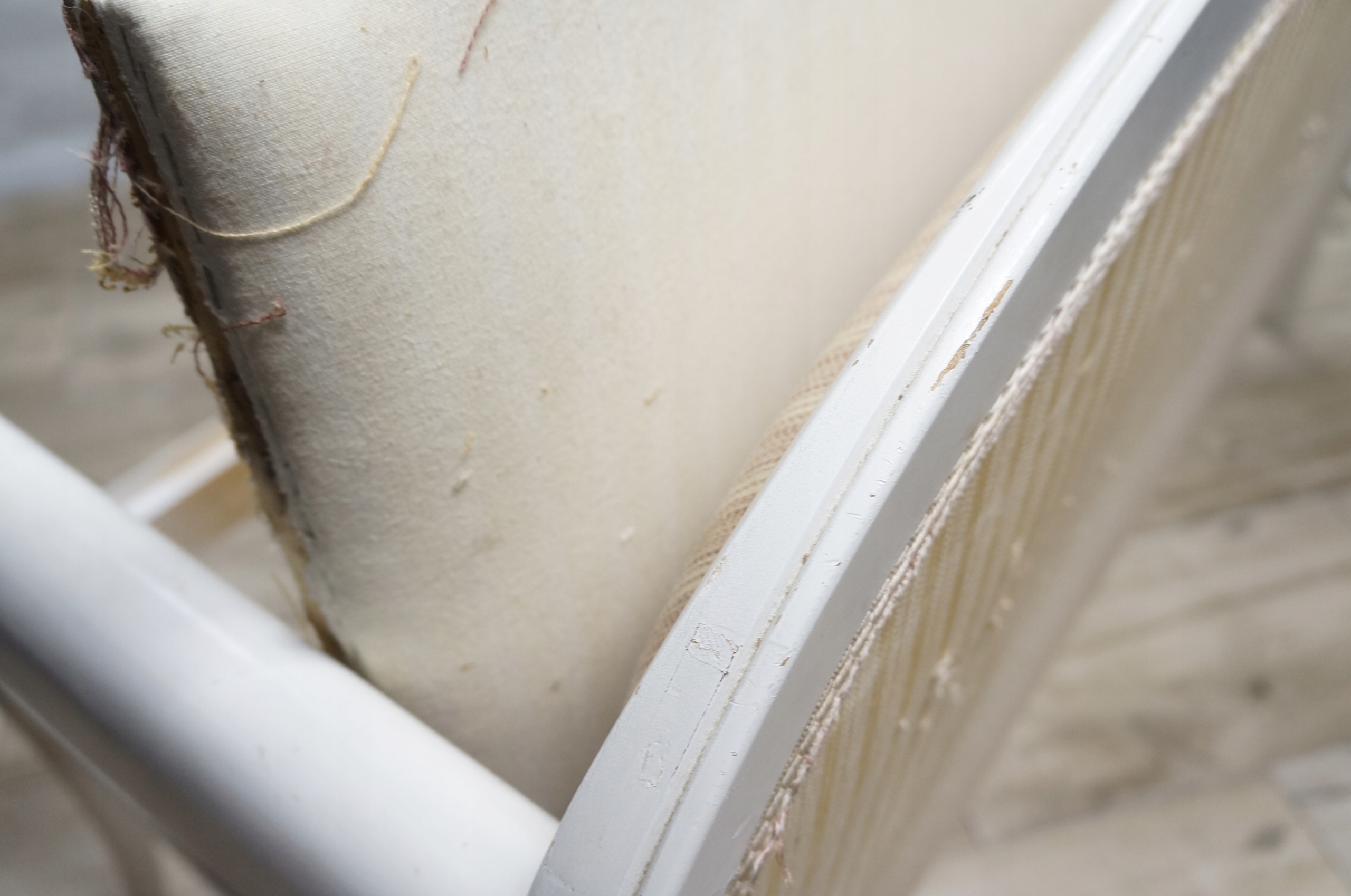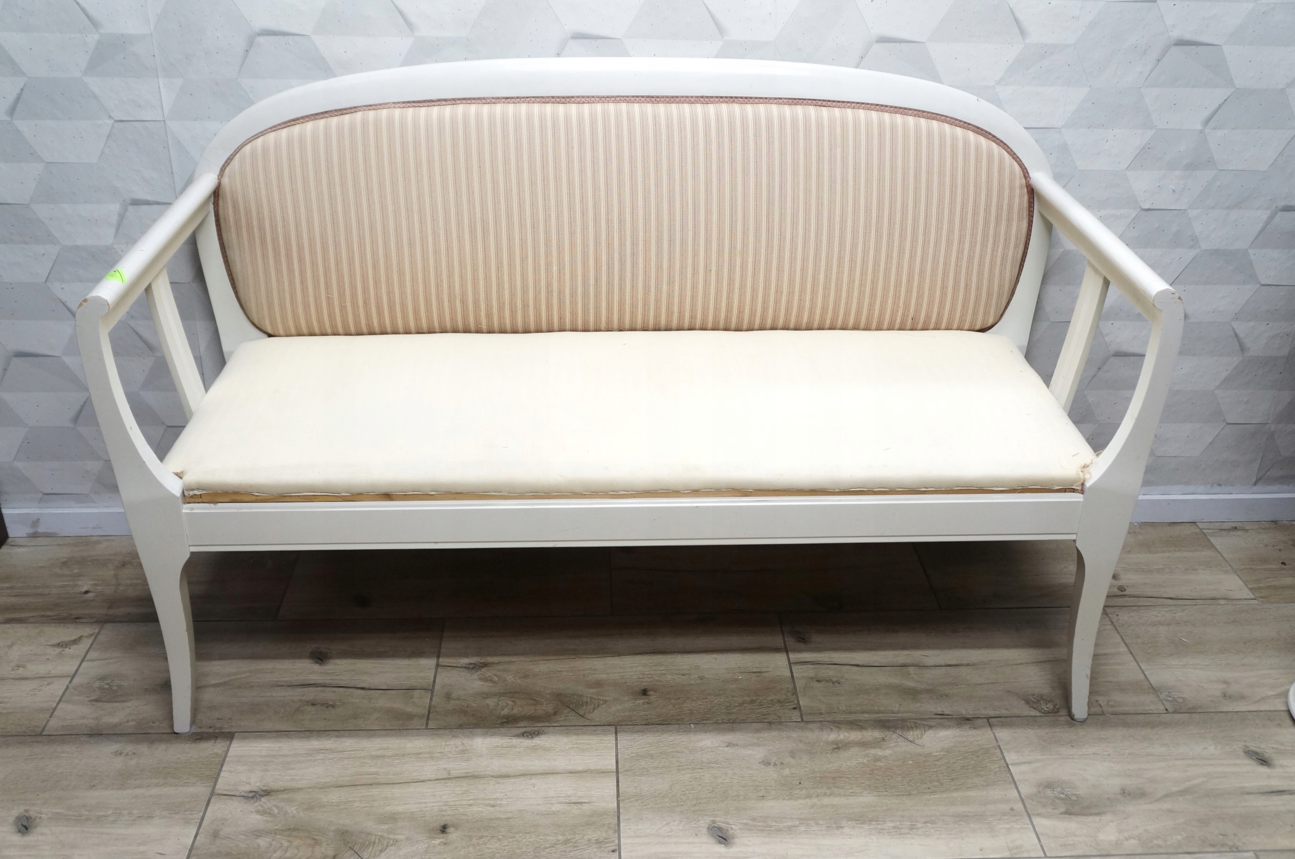 Диван беленый, спинка обтянута полосатой тканью, грязный цвет розовый
