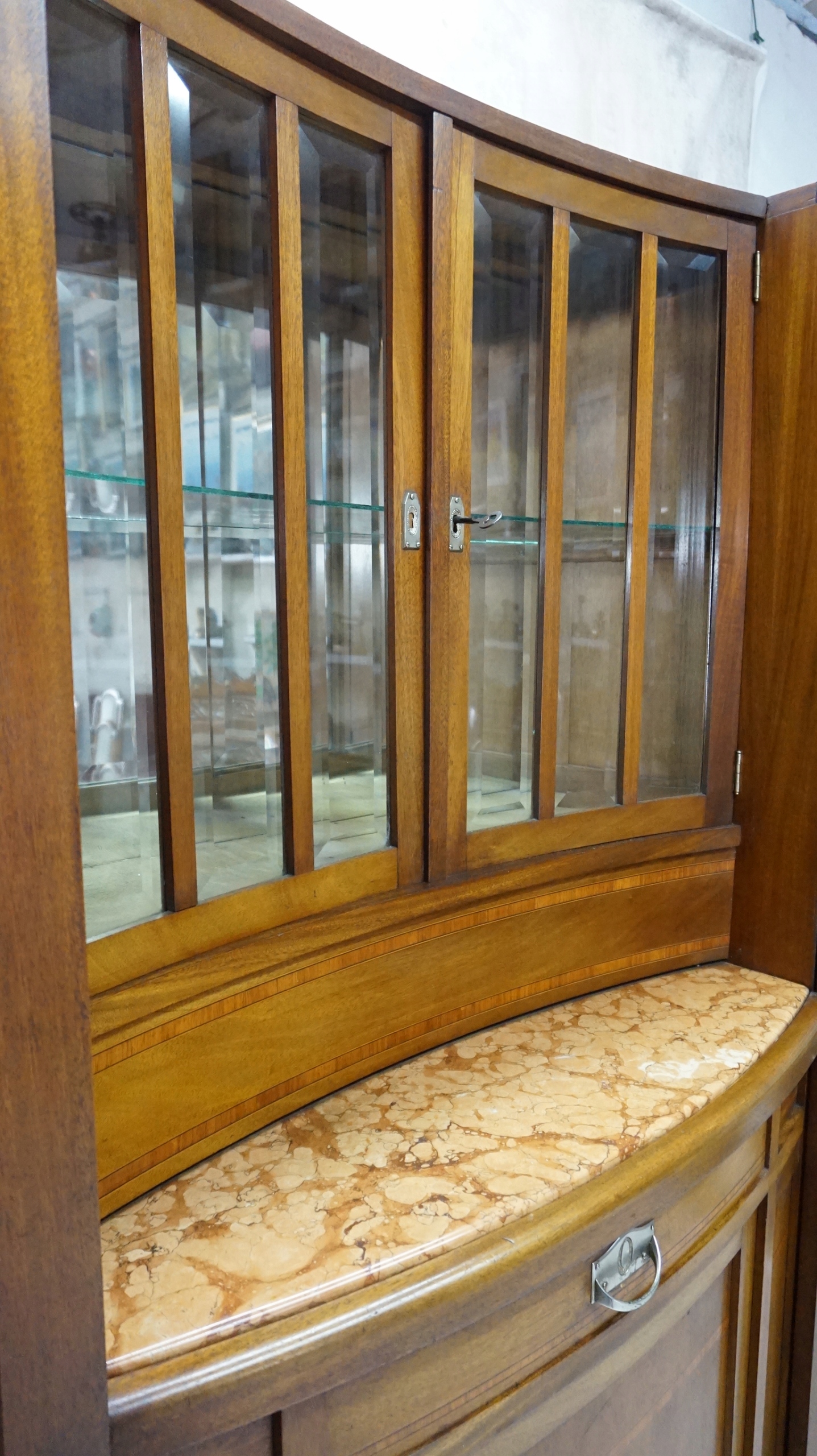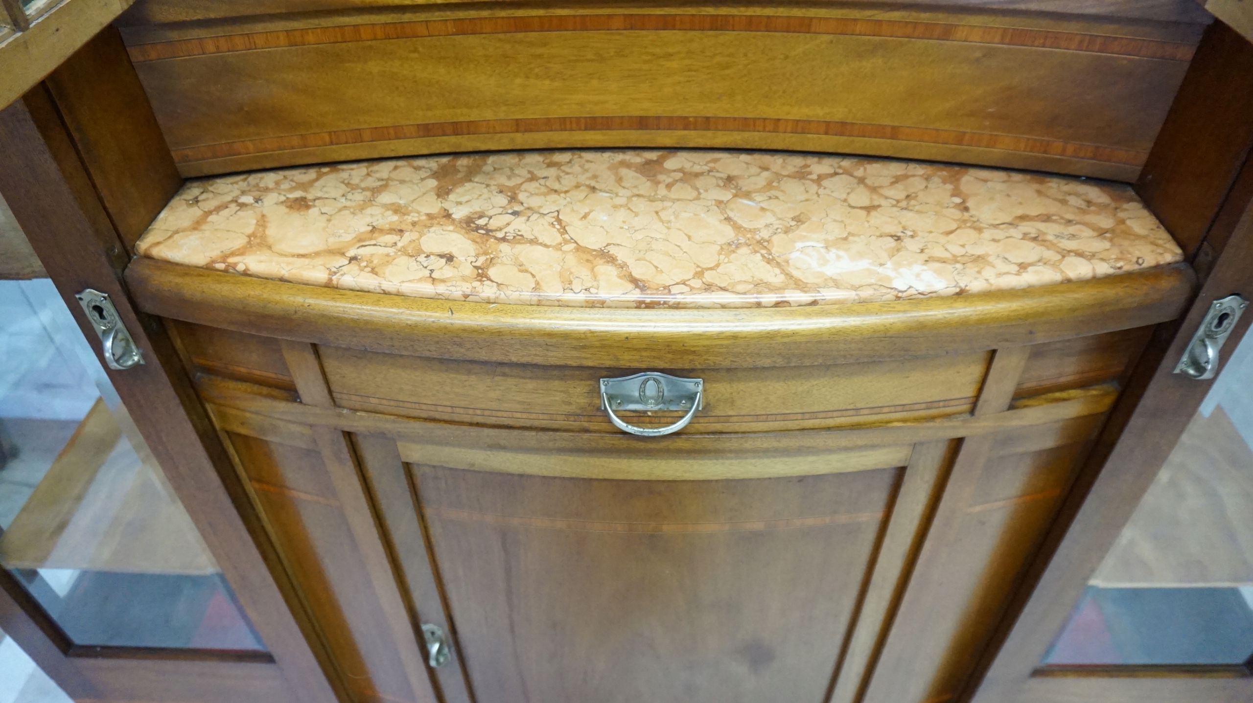 Верхнюю часть занимает двухдверный стеклянный шкаф со стеклянной полкой и зеркалом. Мраморная столешница лососевого цвета.