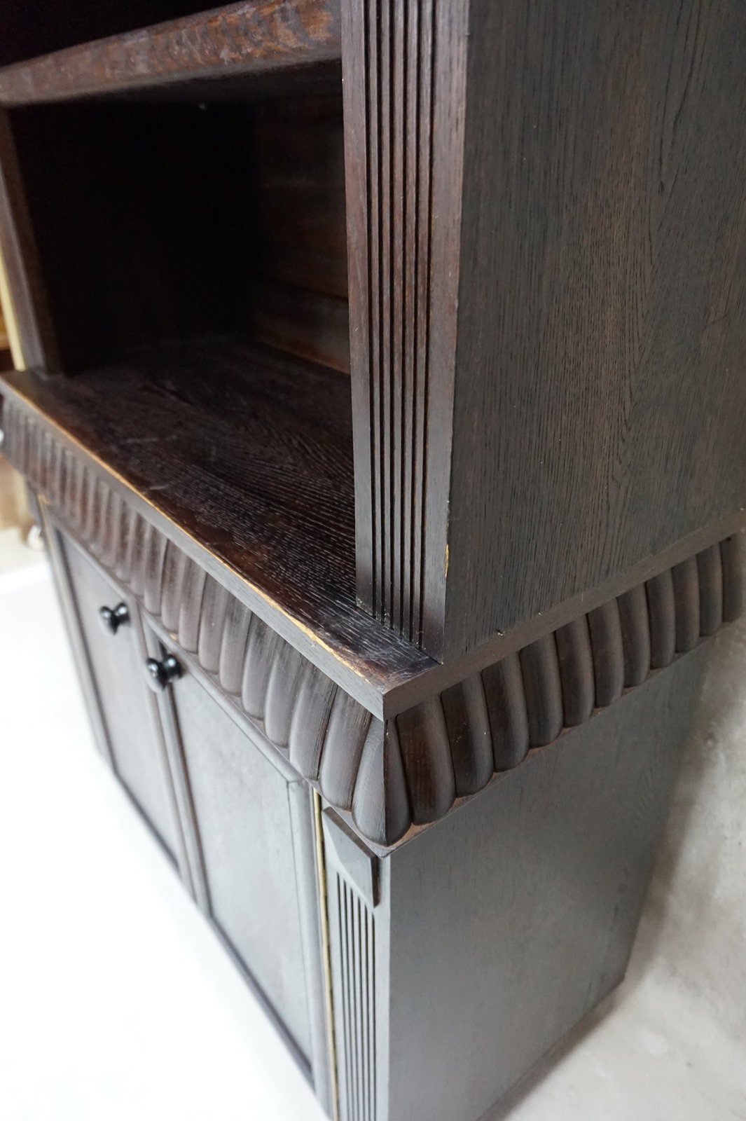Вверху — книжный шкаф с полками для демонстрации тарелок и фарфора.