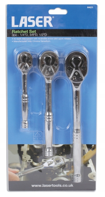 Набор стандартных трещоток 3-х размеров привода с реверсивным действием и быстросъемом, изготовлен из полированного хром-ванадиевого сплава.
