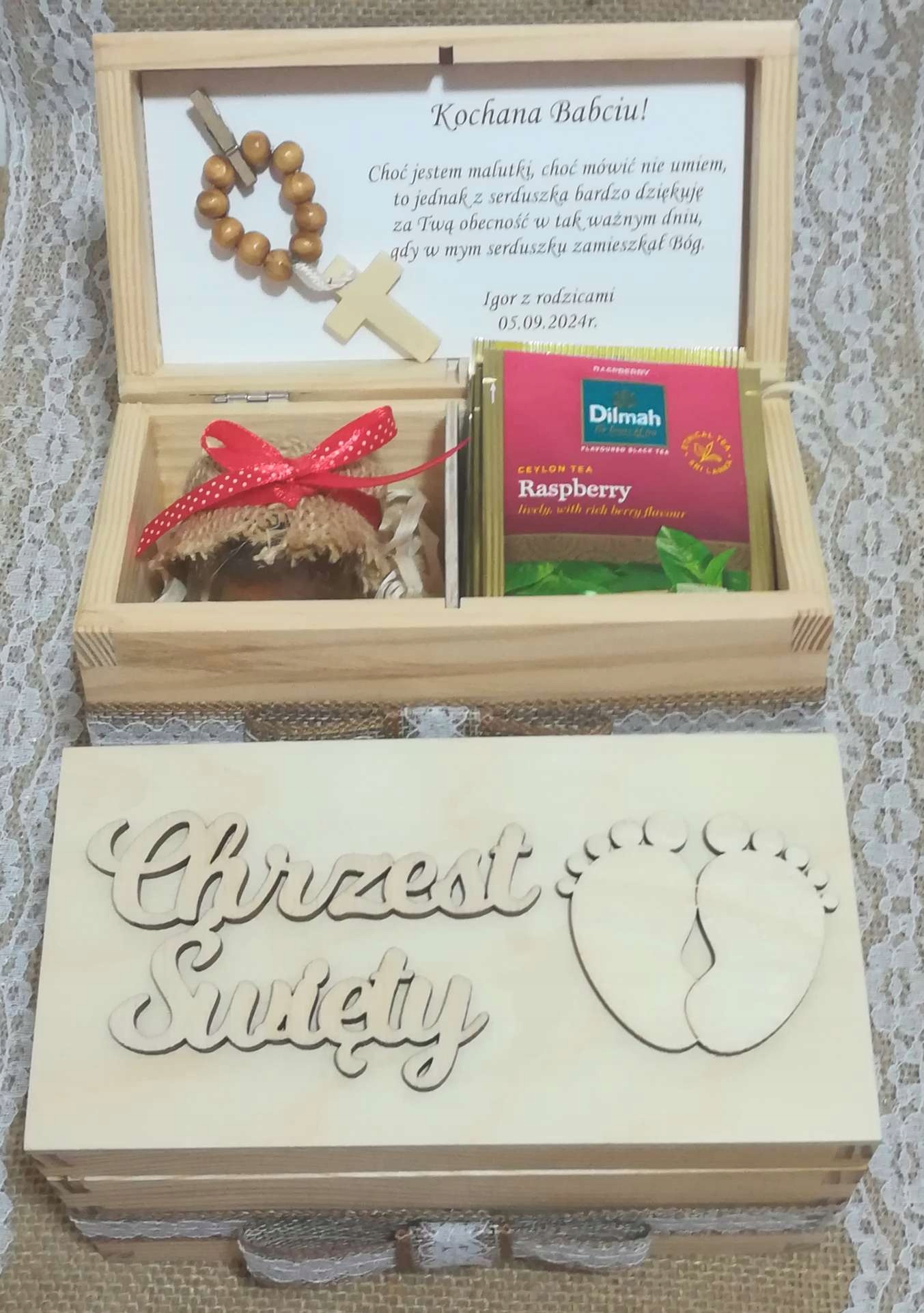 - В середине коробки содержится персонализация: имя ребенка с свиданием церемонии и очаровательной благодаря божественному отфэте или божьей боги или дедс -оеду. !!!