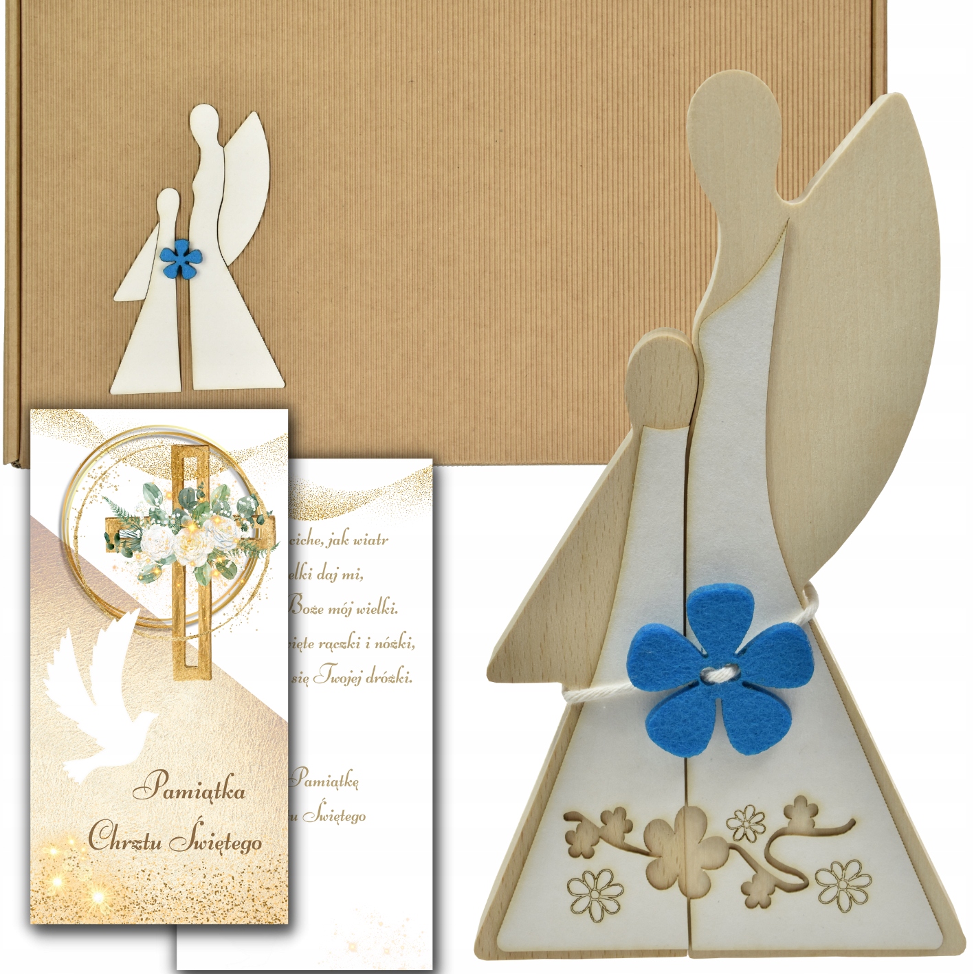 - Два Ангела, высота 22 см, толщина 2,5 см. Ангелочки изготовлены из древесины бука, перевязаны бечевкой с фетровой эмблемой в виде цветка. Ангелочки дополнительно украшены эмблемой из пивной подставки.