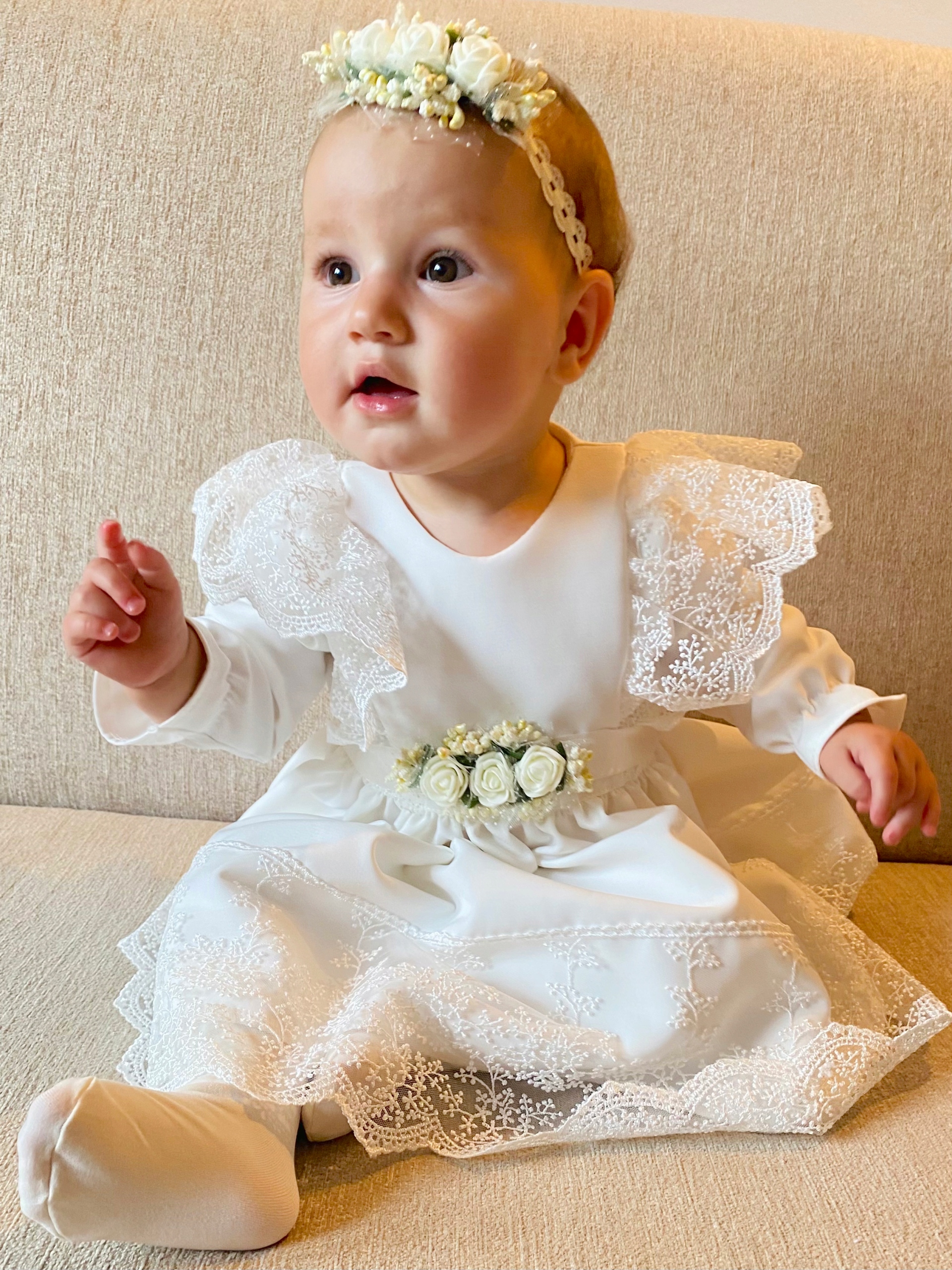 Экру платье с элегантным кружевом крещения с длинными рукавами было разработано с крещением маленькой принцессы, семейным праздником или свадьбой. Зашитый от гладкой, приятной к сенсорной ткани, она была украшена тонким кружевом, которое вещается от талии через плечо к линии полосы движения сзади. Спасибо, к которому кружево образует милые бабочки на плечах. Дно представляет собой слегка морщинистую юбку со вшитой кружевом. Рукава на запястьях были слегка сморщены на упругости, так что рукава не падают на руку. На спине платье закреплено тремя, не -нен -неннон -сософизированными пружинными защелками. Верхне облицован хлопковой подкладкой для комфорта ребенка.