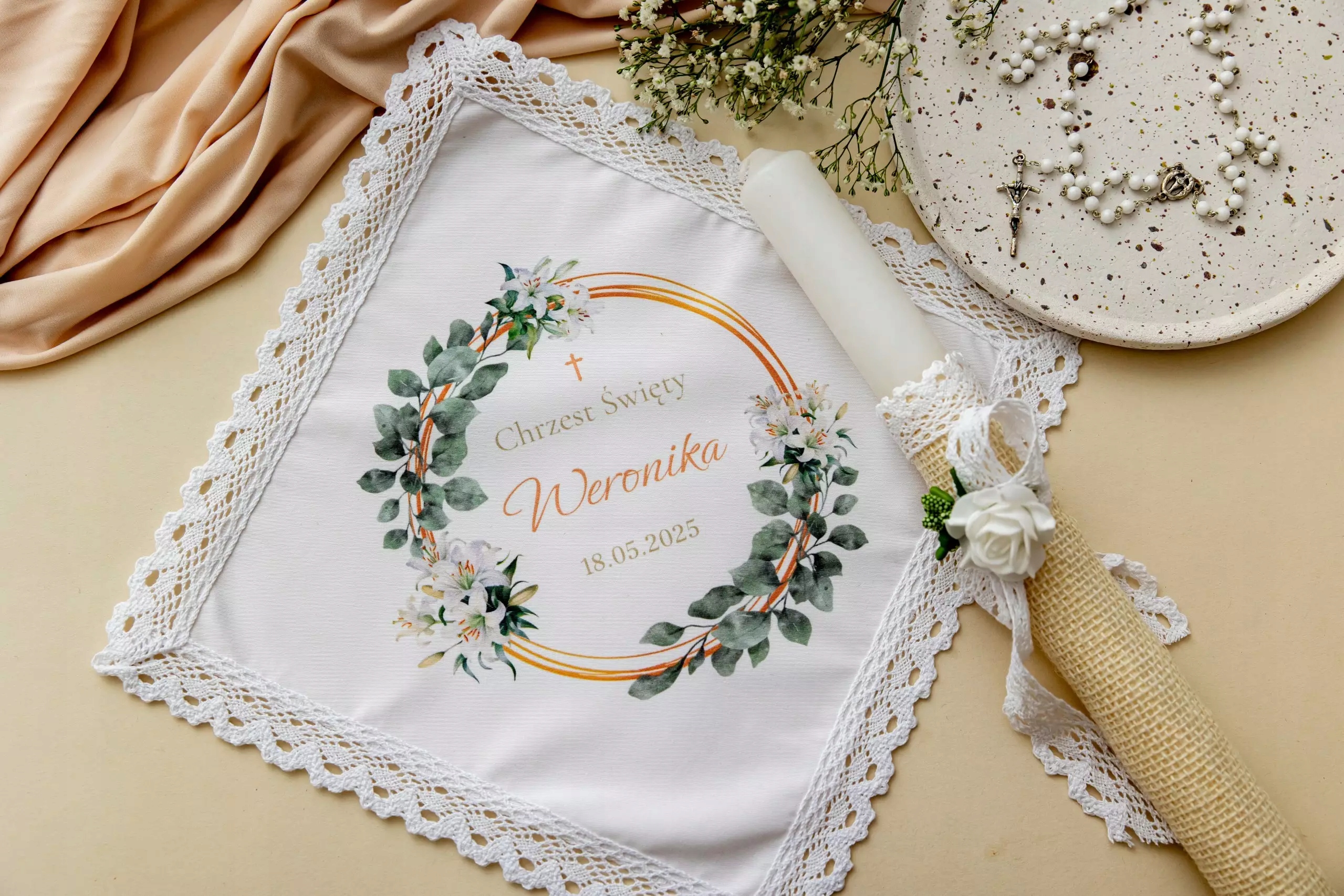 Главная одежда печатается по имени ребенка и дате крещения - благодаря этому это становится уникальным семейным сувениром, который приобретает личное значение и будет прекрасным воспоминанием через годы.