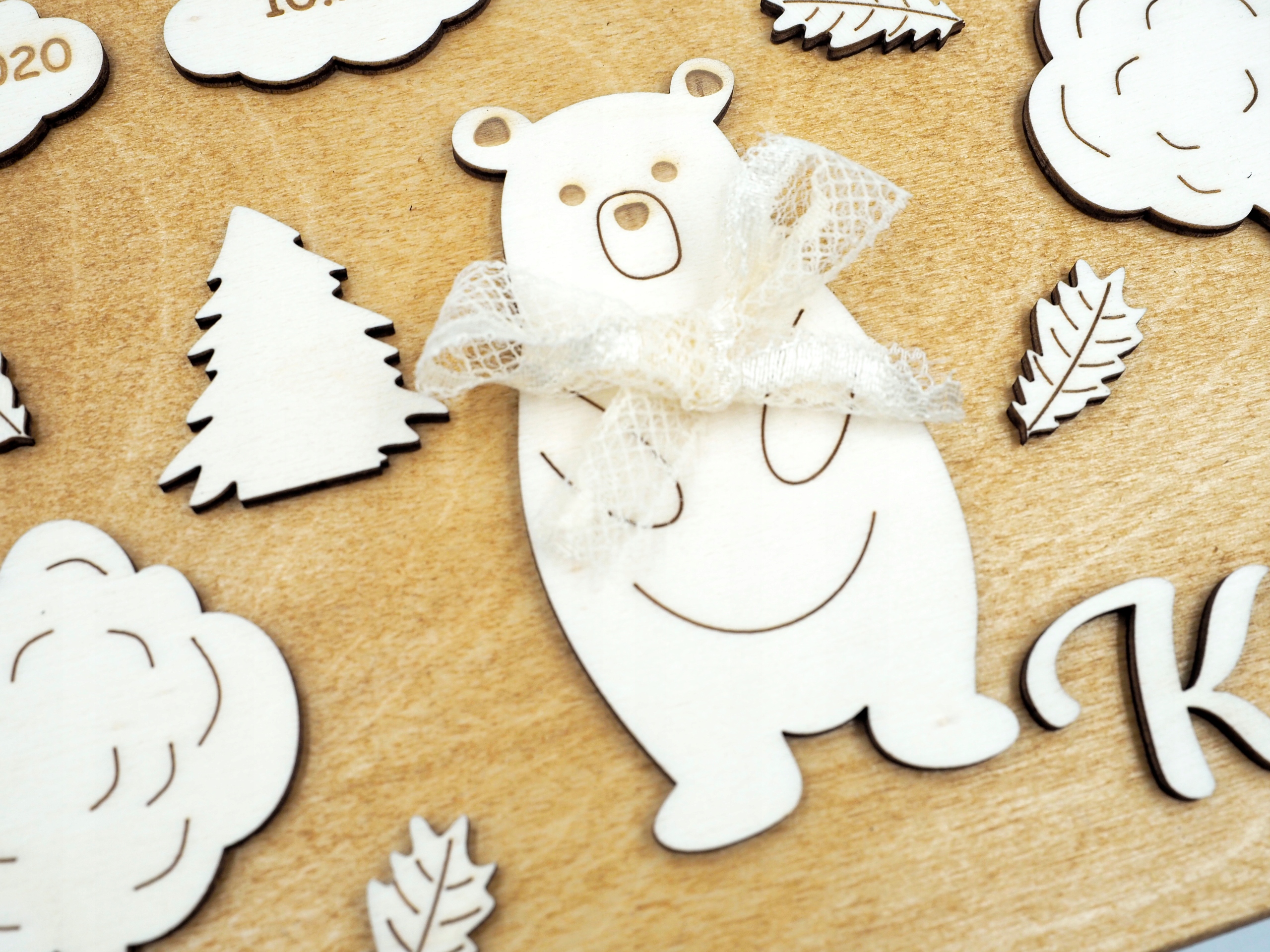 - декоративное украшение в виде медведя с бантом в окружении деревьев, листьев и облаков