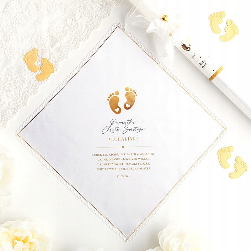 платок к крещению, украшенный отпечатками золотых ног, стихотворения, имени ребенка и даты церемонии. Это красивый сувенир крещения для мальчика и девочки, которую может дать крестная мать.