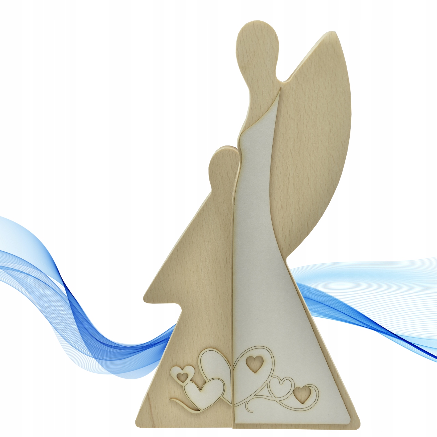 - Два Ангела, высота 22 см, толщина 2,5 см. Ангелочки изготовлены из древесины бука, перевязаны веревочкой с фетровой эмблемой в виде сердечка. Ангелочки дополнительно украшены эмблемой из пивной подставки.