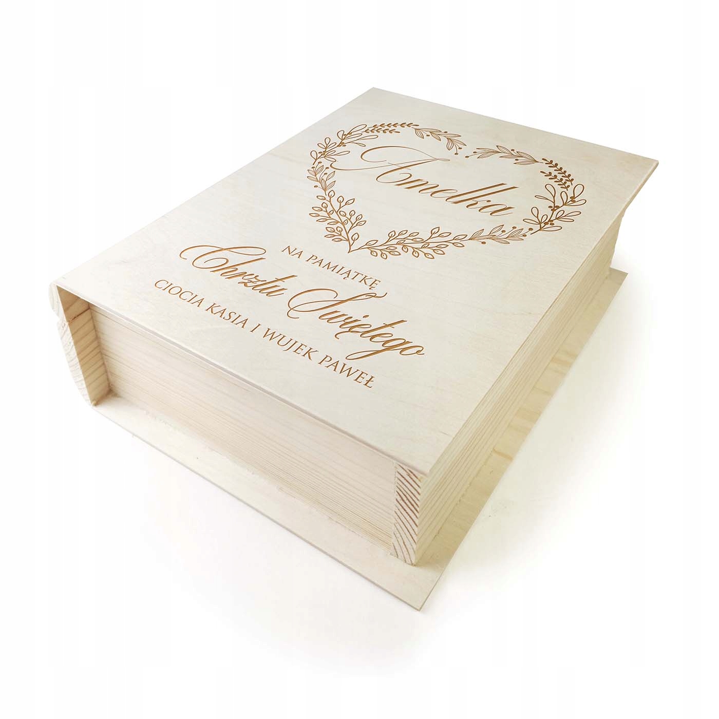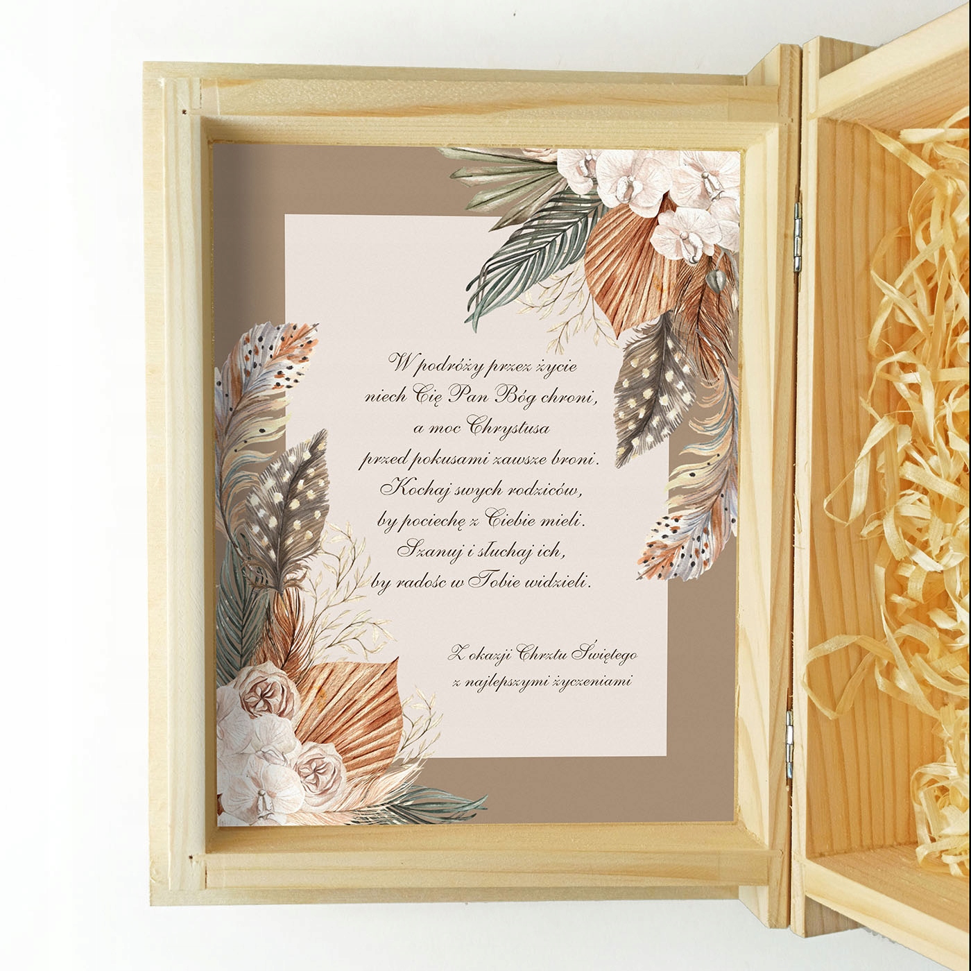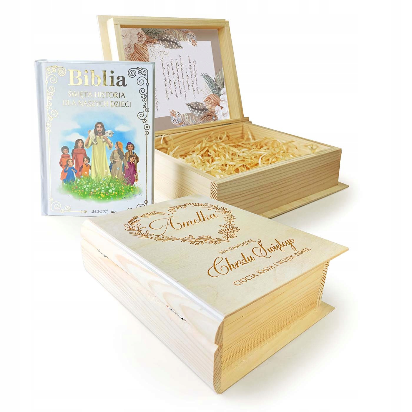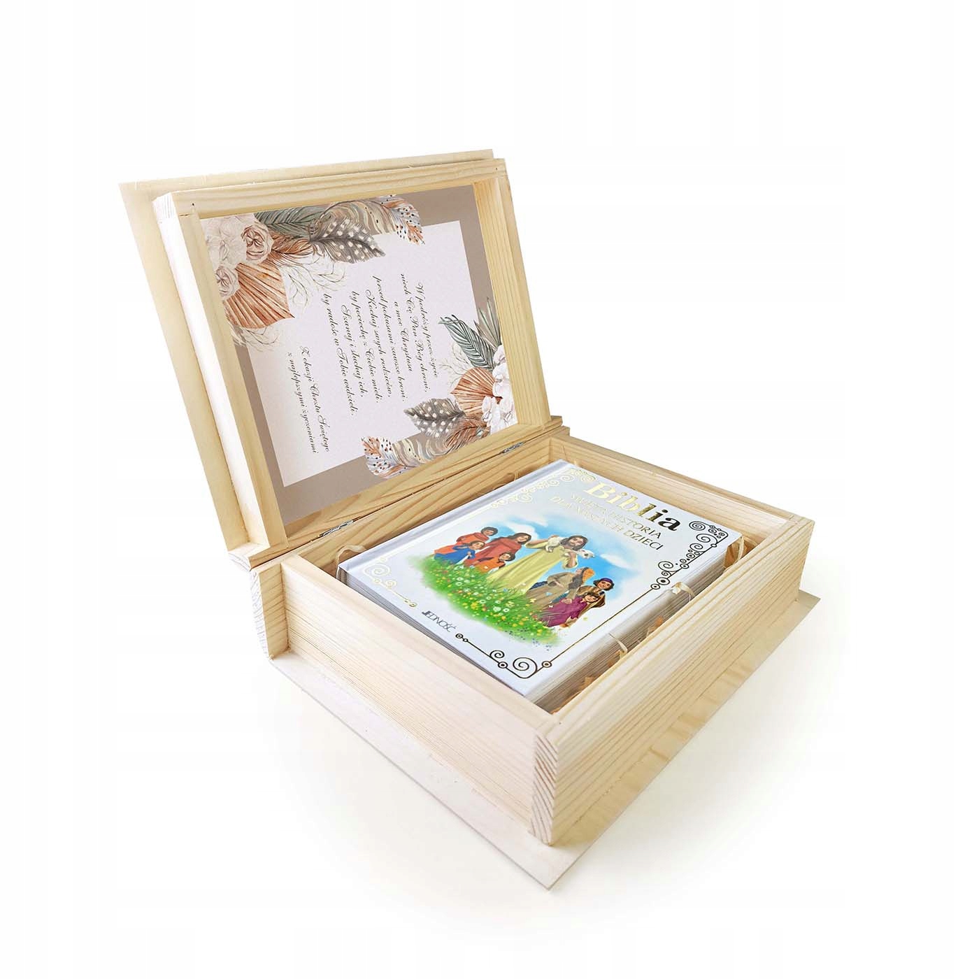 В комплект входит Библия для ребенка и декоративная деревянная шкатулка, которая благодаря гравировке станет приятным воспоминанием в будущем. Внутри коробки красочная графика в стиле бохо с пожеланиями малышу ко Дню Святого Крещения.