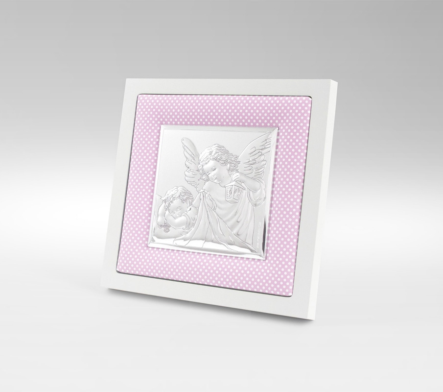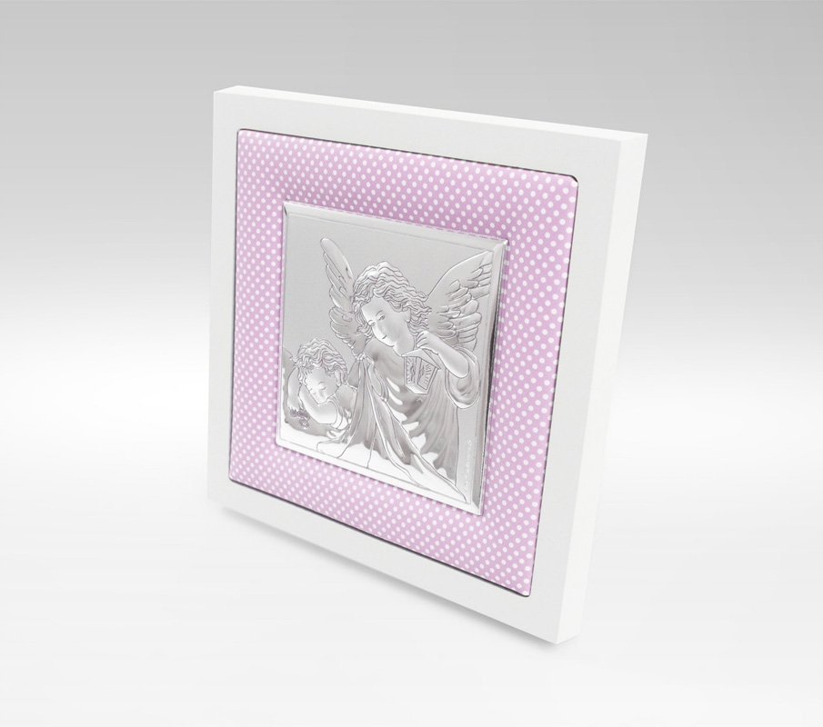 Серебряная картинка на Крещение с изображением ангела с фонарем над спящим ребенком. Картина помещена на розовую подушку.