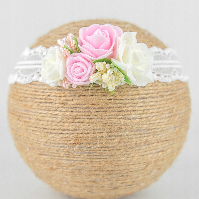 Повязка на голову изготовлена вручную, с двумя розовыми розами и двумя розами цвета экрю.