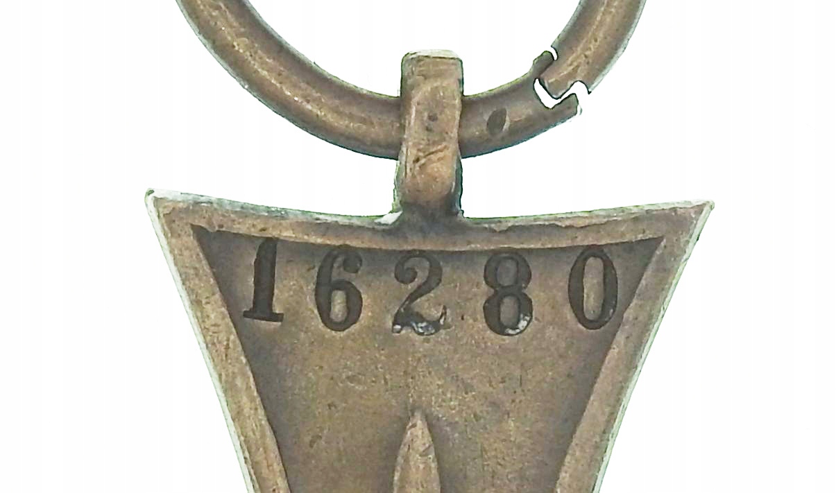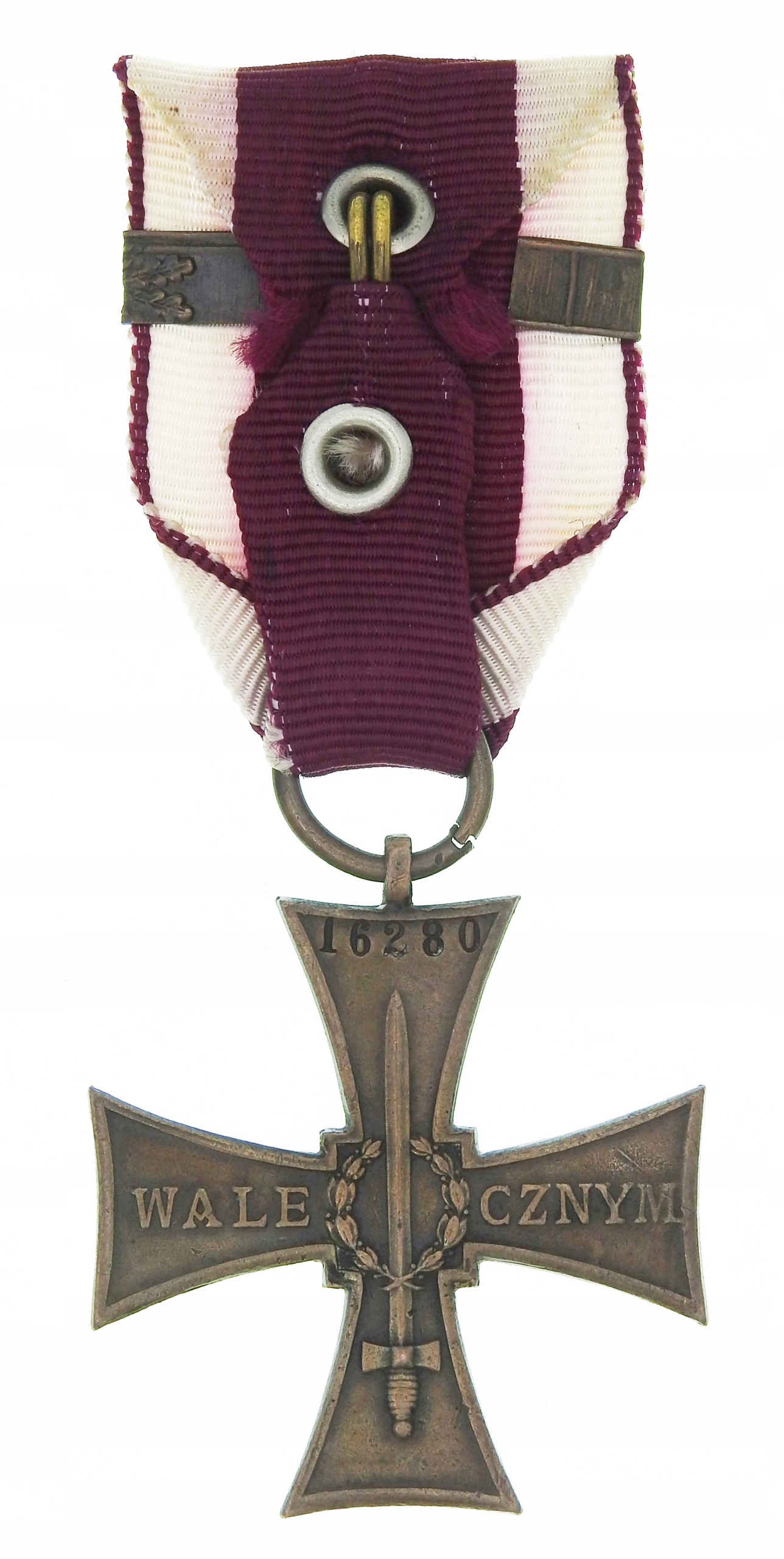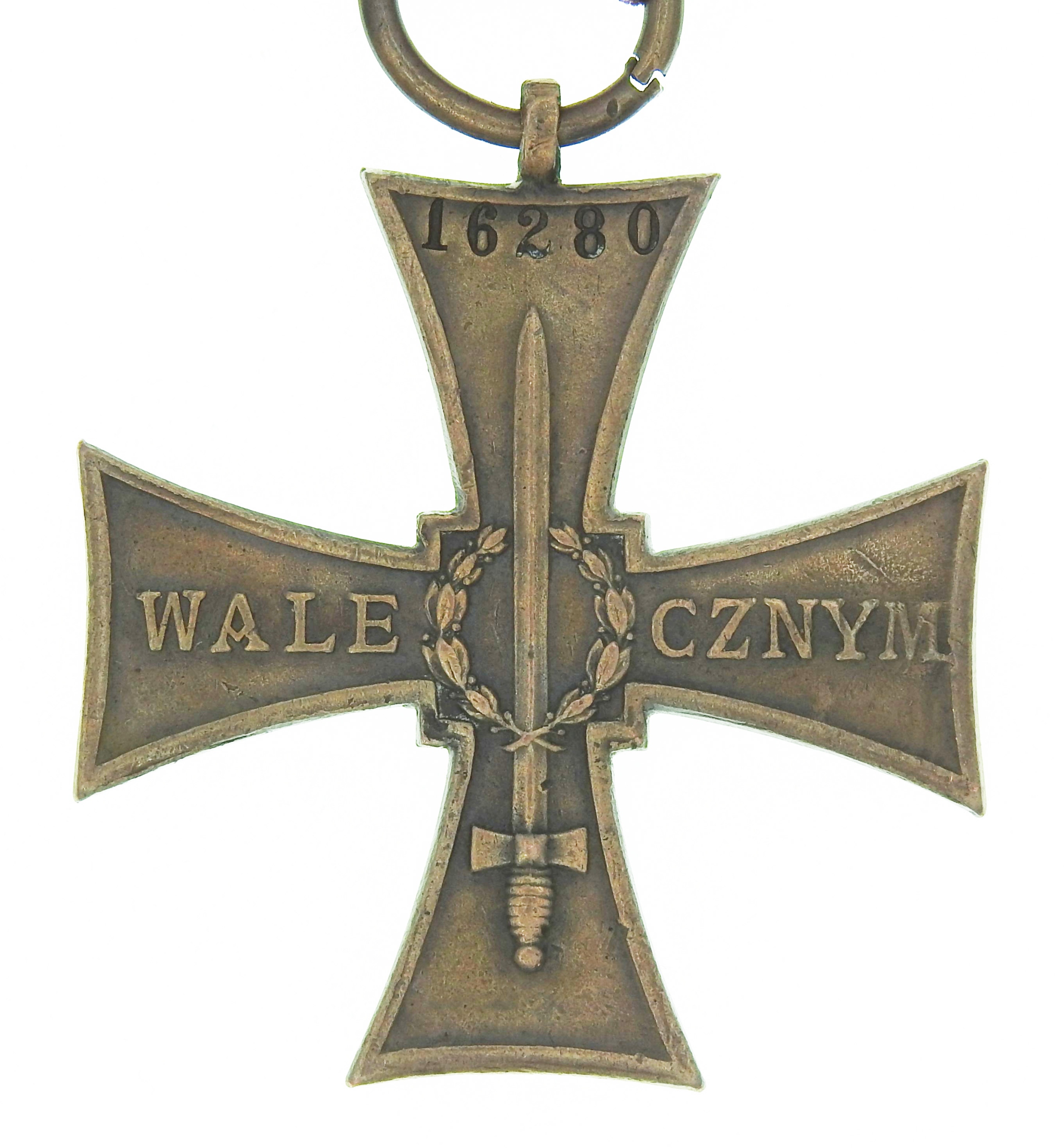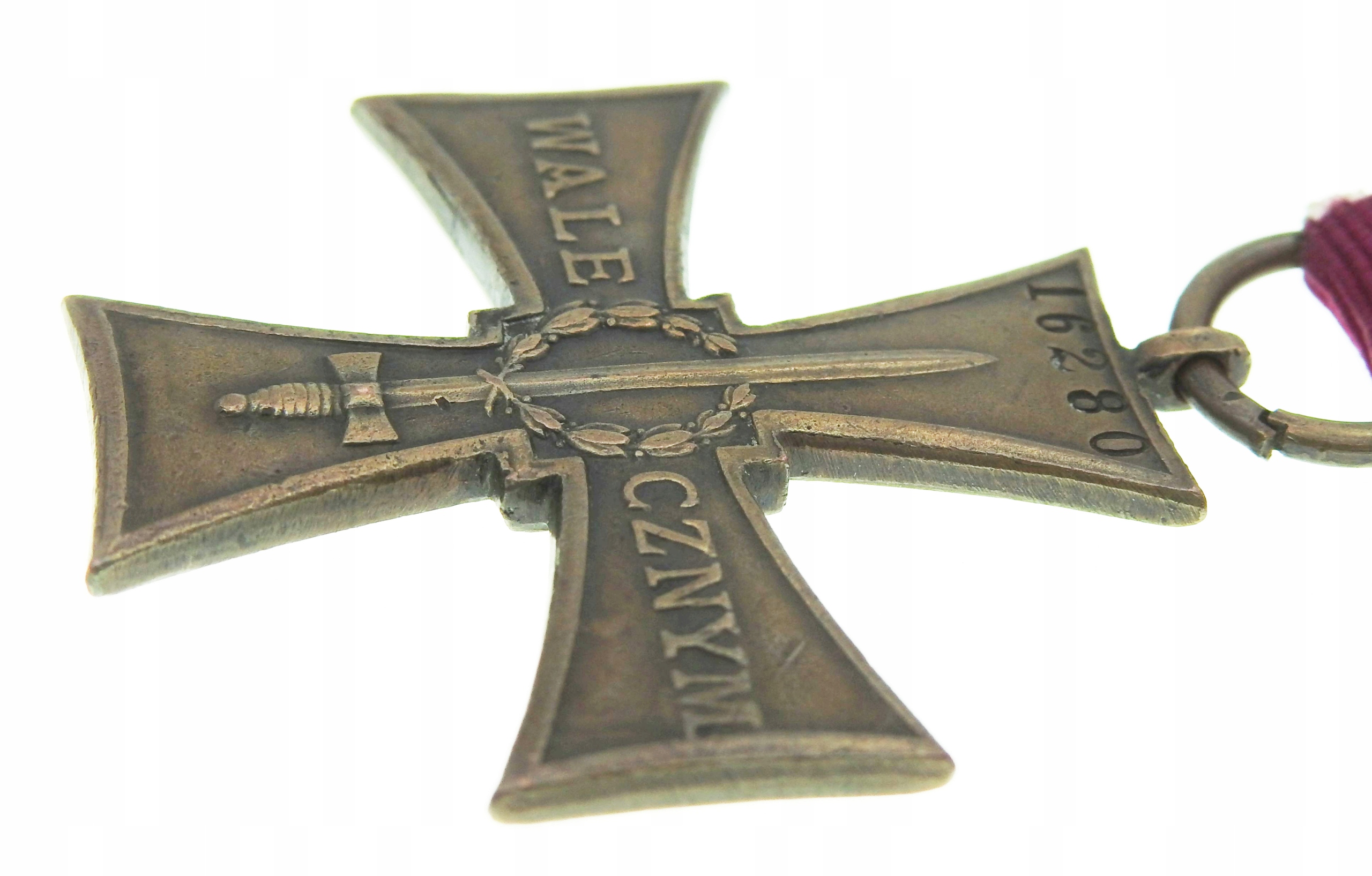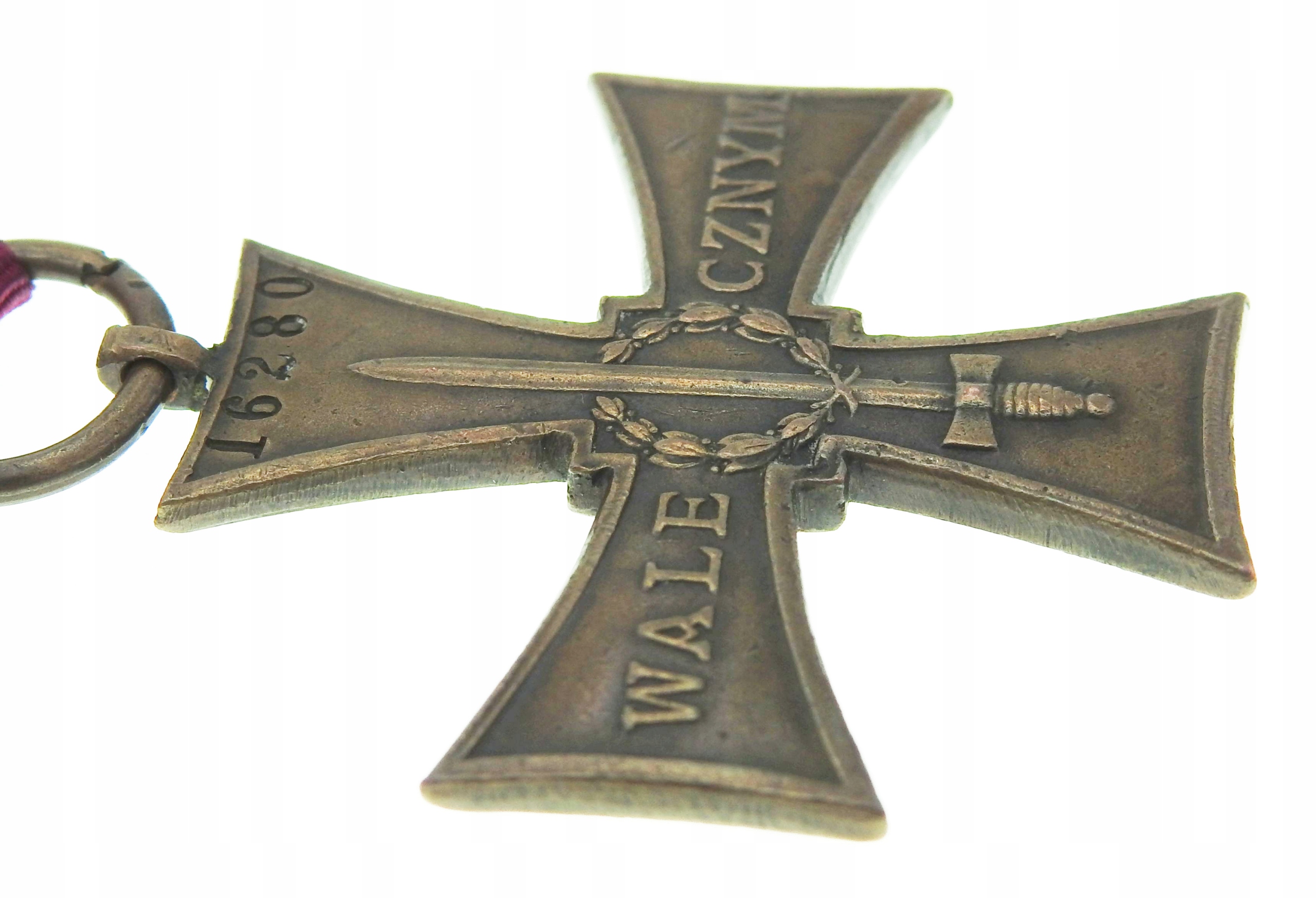 Крест с ~ 43,5 x 43,5 мм (измерение без разъема), подключенное кольцо к канавке, число, пораженное механическим числом, лента пост -ар, оригинальный «grzegorz krogulec», «Крест доблести», страница 160 иллюстрация 68), поведение, как на снимках, видимые трассы использования, оригинальный