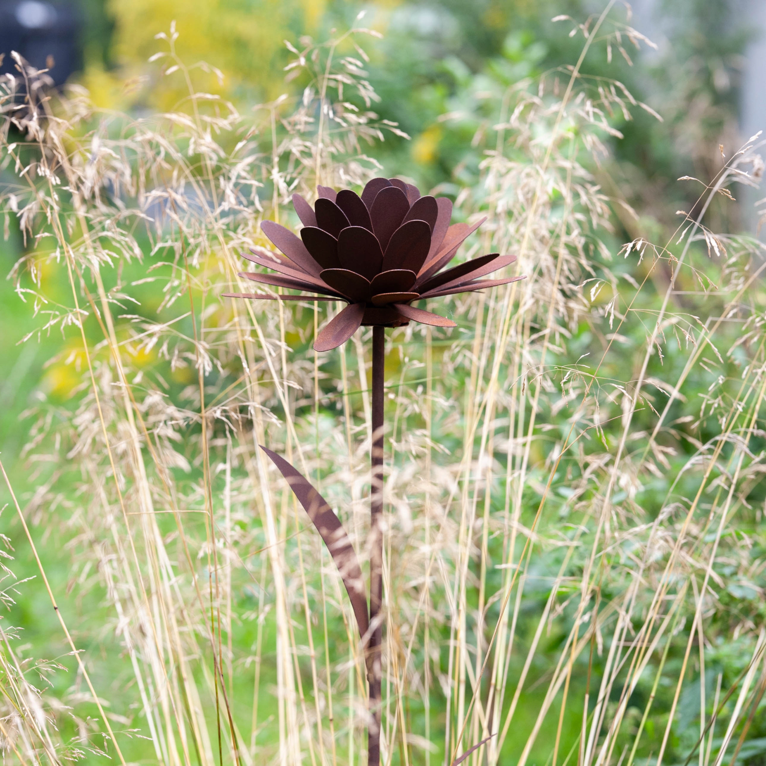 Основным элементом этого украшения является красивый цветок шириной 26 см, который впечатляет своим реалистичным видом. Изготовленный из стали исключительного качества, цветок выделяется не только своей формой, но и уникальной отделкой. Поверхность цветка покрыта экологическим слоем ржавчины, образовавшимся естественным путем под воздействием погодных условий. Это рустикальное покрытие придает всему предмету необыкновенный характер, отсылая к естественной красоте и процессам, происходящим в природе.