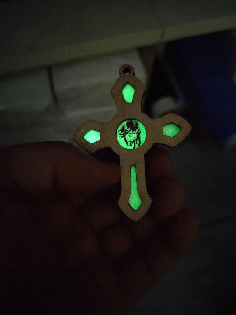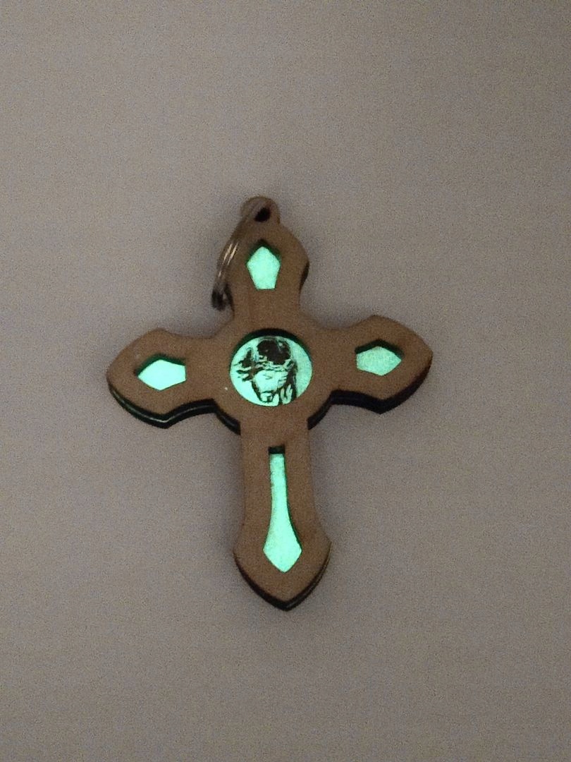 Нижний слой покрыт люминесцентной краской, благодаря которой брелок светится в темноте после воздействия света, создавая эффект как на прилагаемых фото.