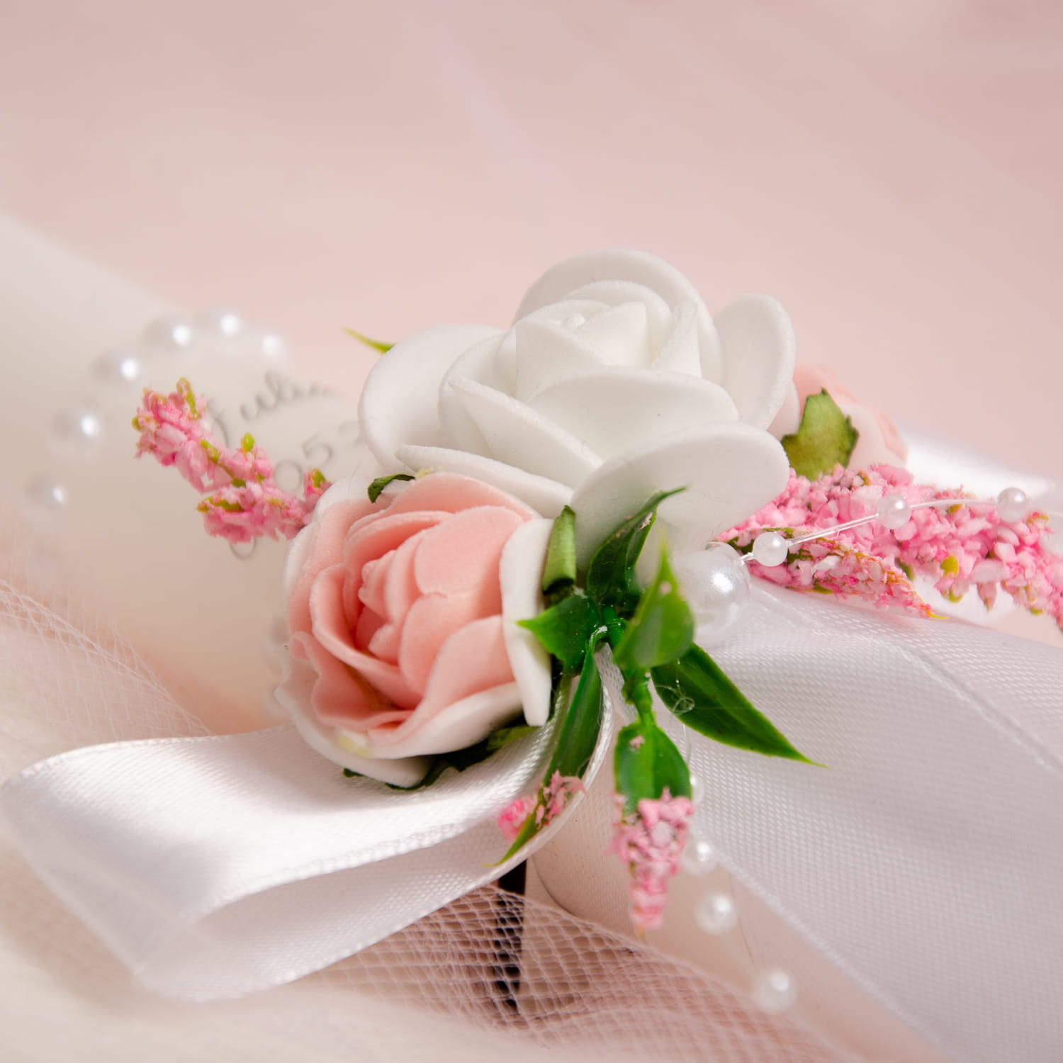 Красивая крестильная свеча, декорированная вручную. Подготовлено с величайшим чувством стиля. Изготовлен из компонентов высочайшего качества. Нежные, розово-белые цвета прекрасно подойдут в качестве сувенира на Крещение девочке. Ее очарование усиливает красивая цветочная аппликация, украшенная белым бантом и жемчугом.