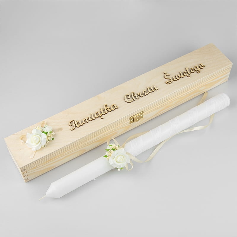 из неокрашенного и нелакированного дерева. Имеет золотую застежку. Крышка украшена фанерной надписью «Сувенир Святого Крещения» и букетом роз цвета экрю, фурнитурой цвета экрю, жемчужными тычинками и лентой цвета экрю.