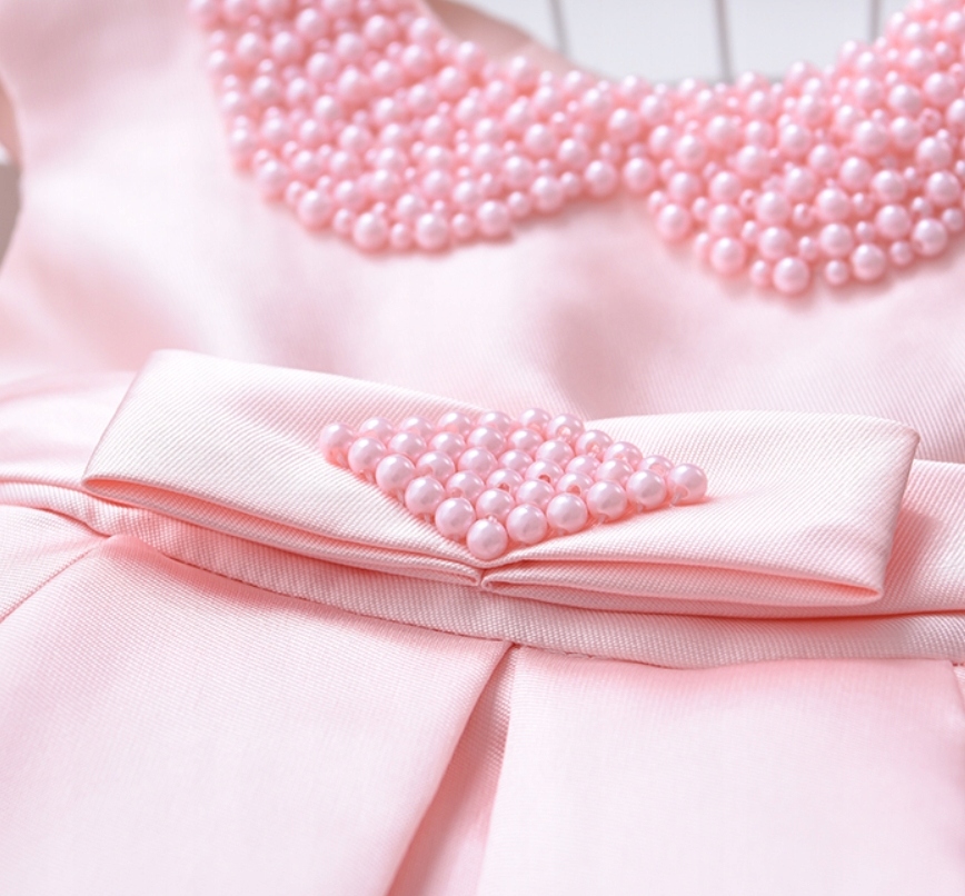 Верх платья приталенный и застегивается сзади на молнию. Воротник и пояс украшены сверкающим розовым жемчугом.