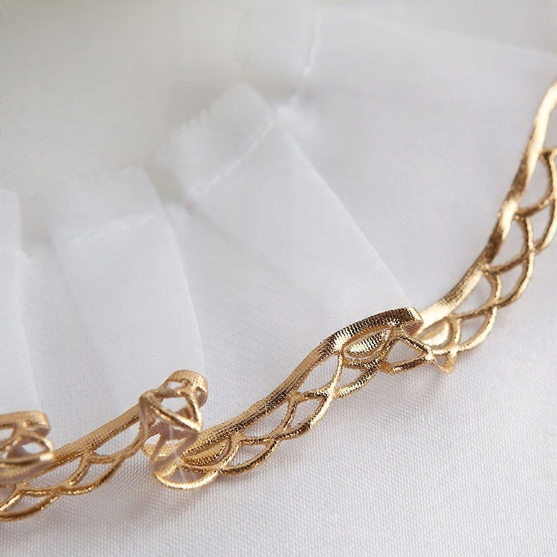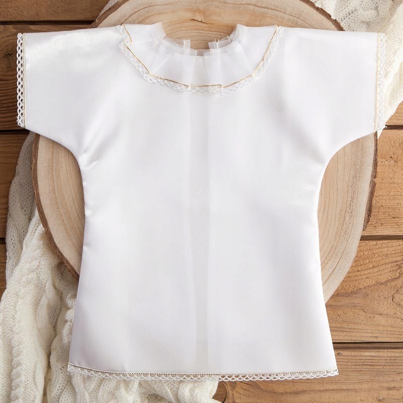 - состав: атласный крестильный халат в форме платья, отделанный шифоном и ажурным кружевом золотого цвета.
