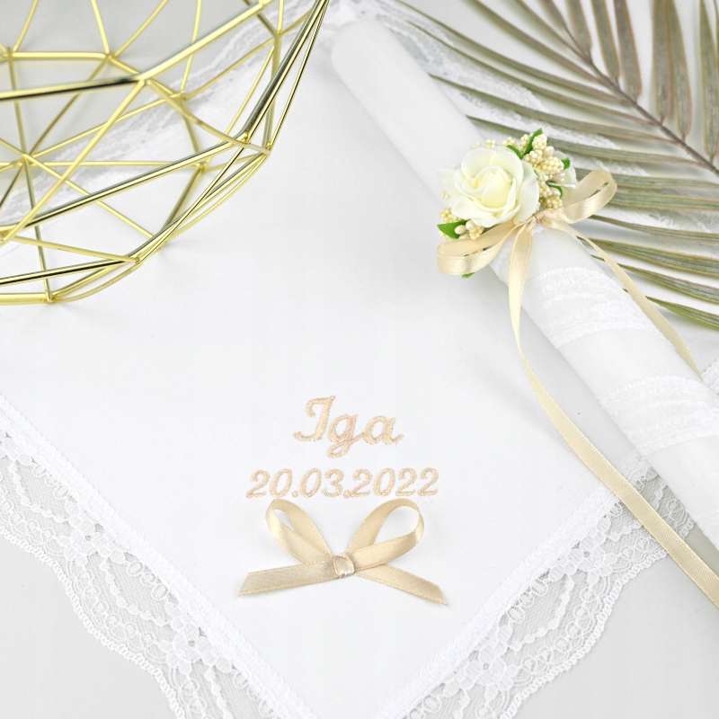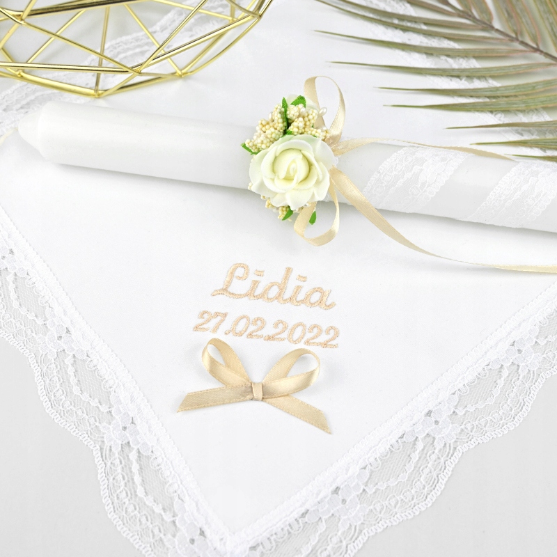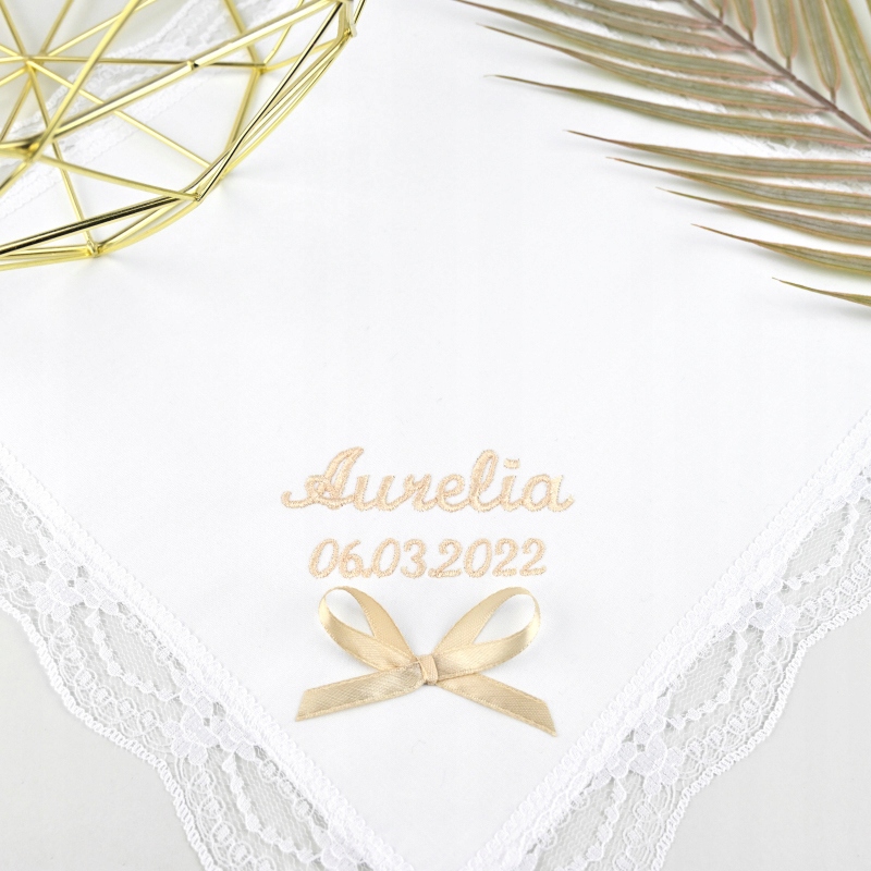 - вышивка выполнена нитью цвета экрю. В том же цвете имеется атласный бантик, который по цвету создает единое целое с вышивкой.