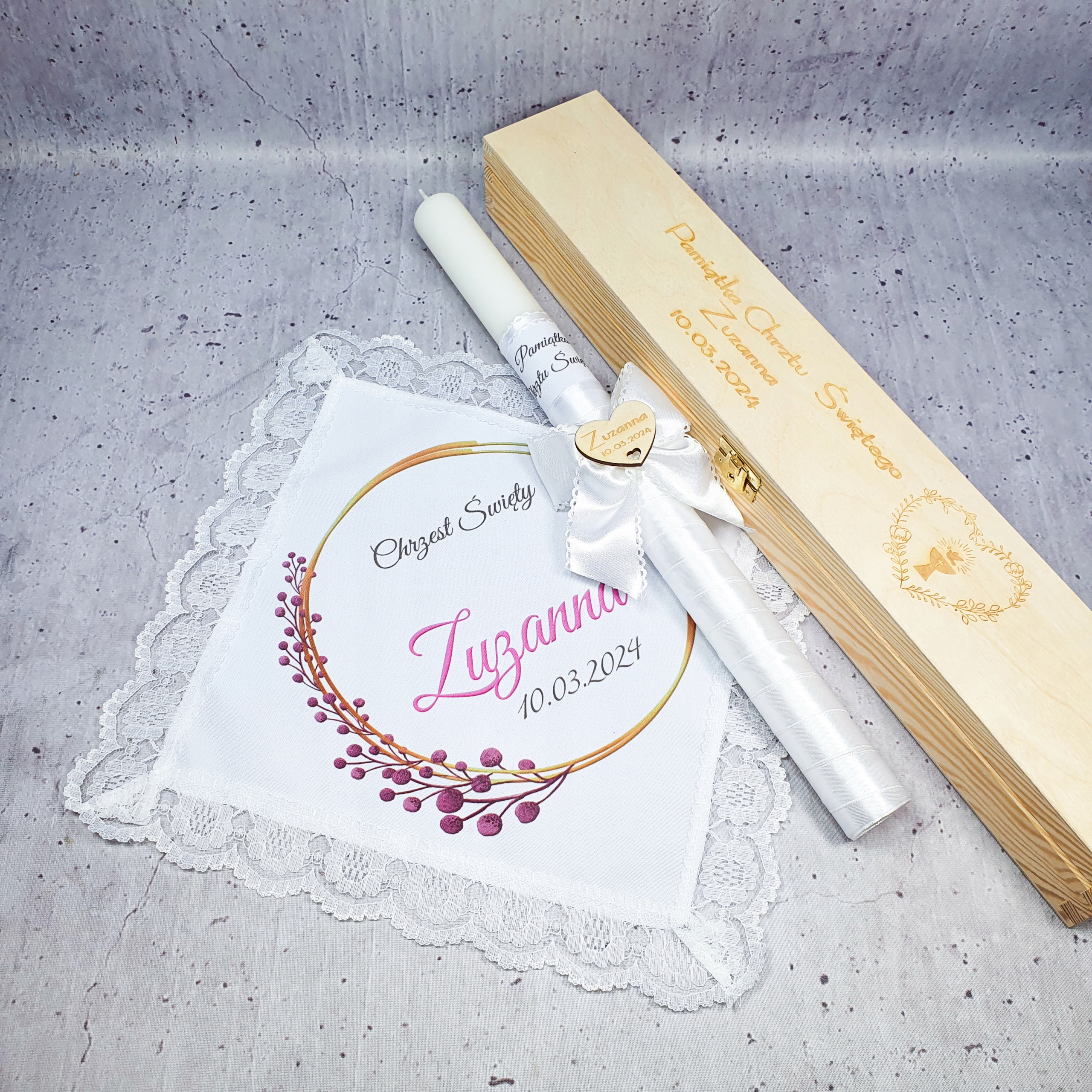 Изящный и тонкий комплект для Святого Крещения. Свеча с мотивом, декорированная вручную.Наши свечи украшены фурнитурой высочайшего качества, продуктом высокого класса, воском хорошего качества.