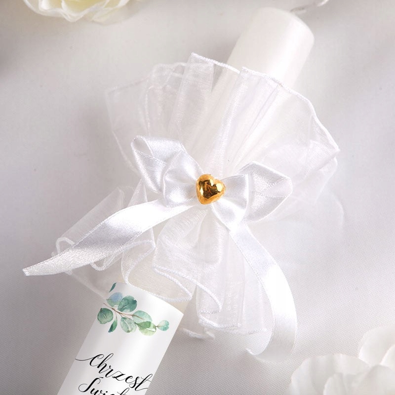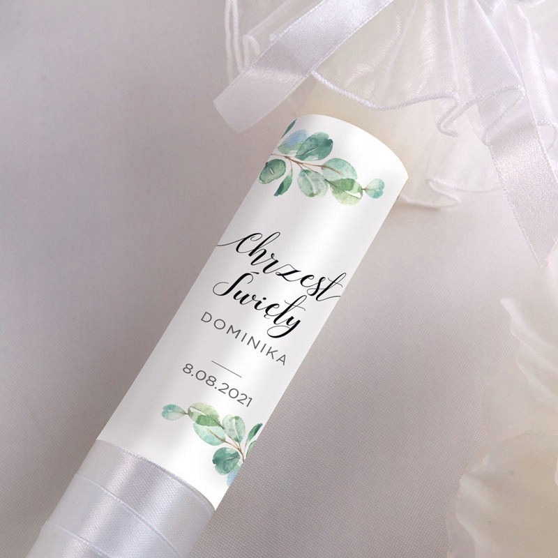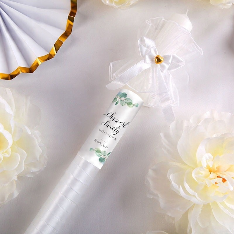 - Свеча для крещения, декорированная вручную белой атласной лентой и эффектным белым декором. <ли> свеча персонализирована наклейкой с именем ребенка и датой торжества, а также современным мотивом ветки эвкалипта. <ли> Благодаря белому и зеленому цветам подойдет как мальчикам, так и девочкам.
