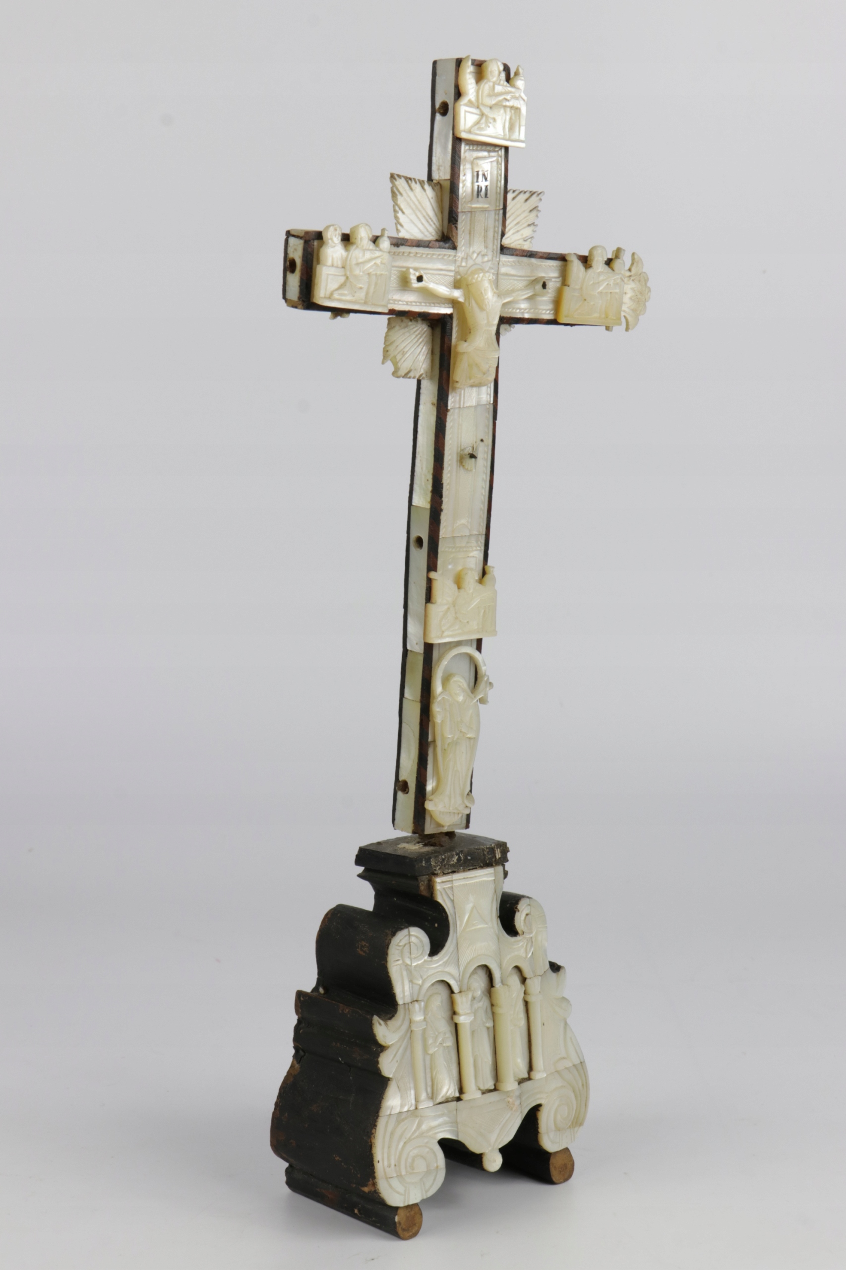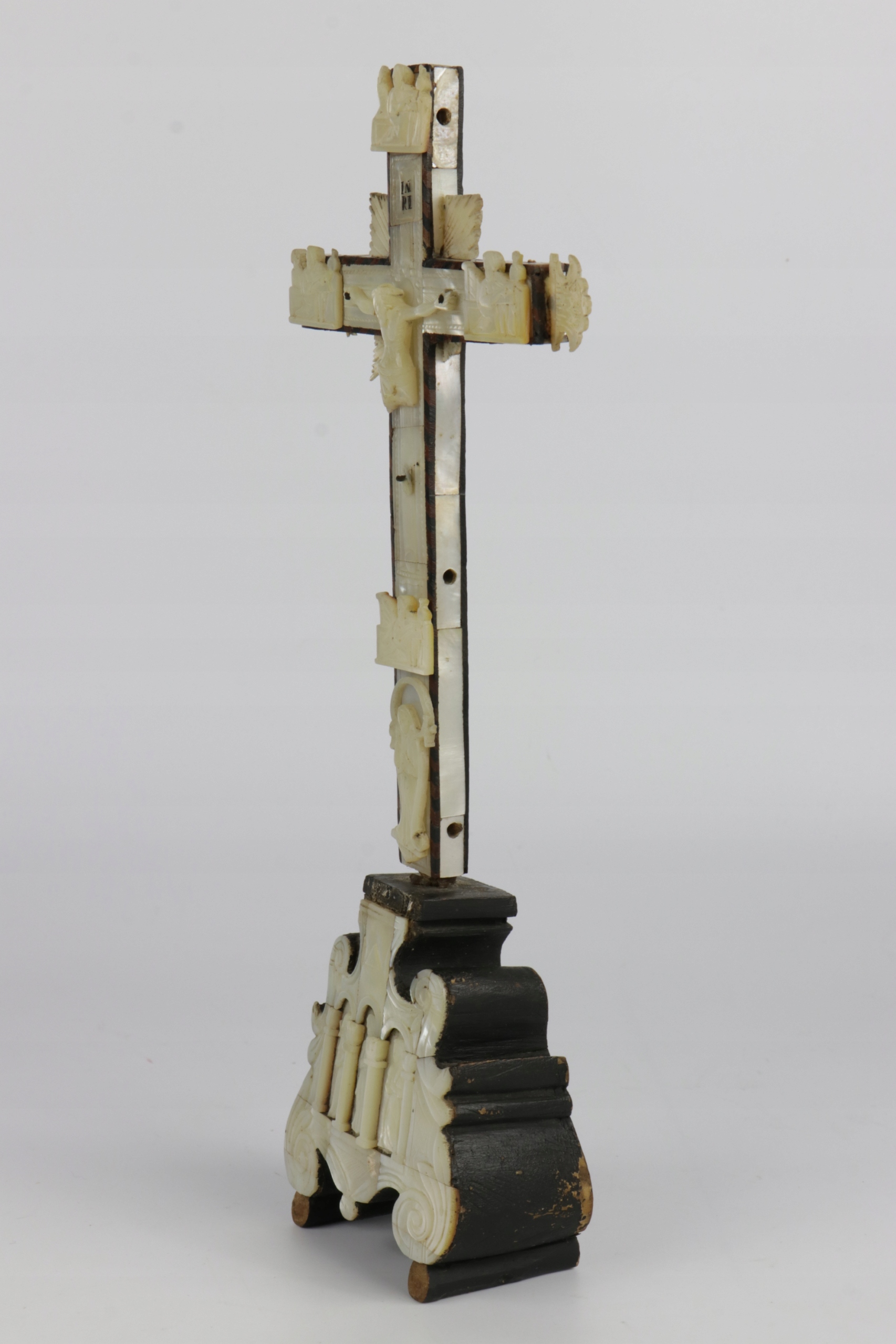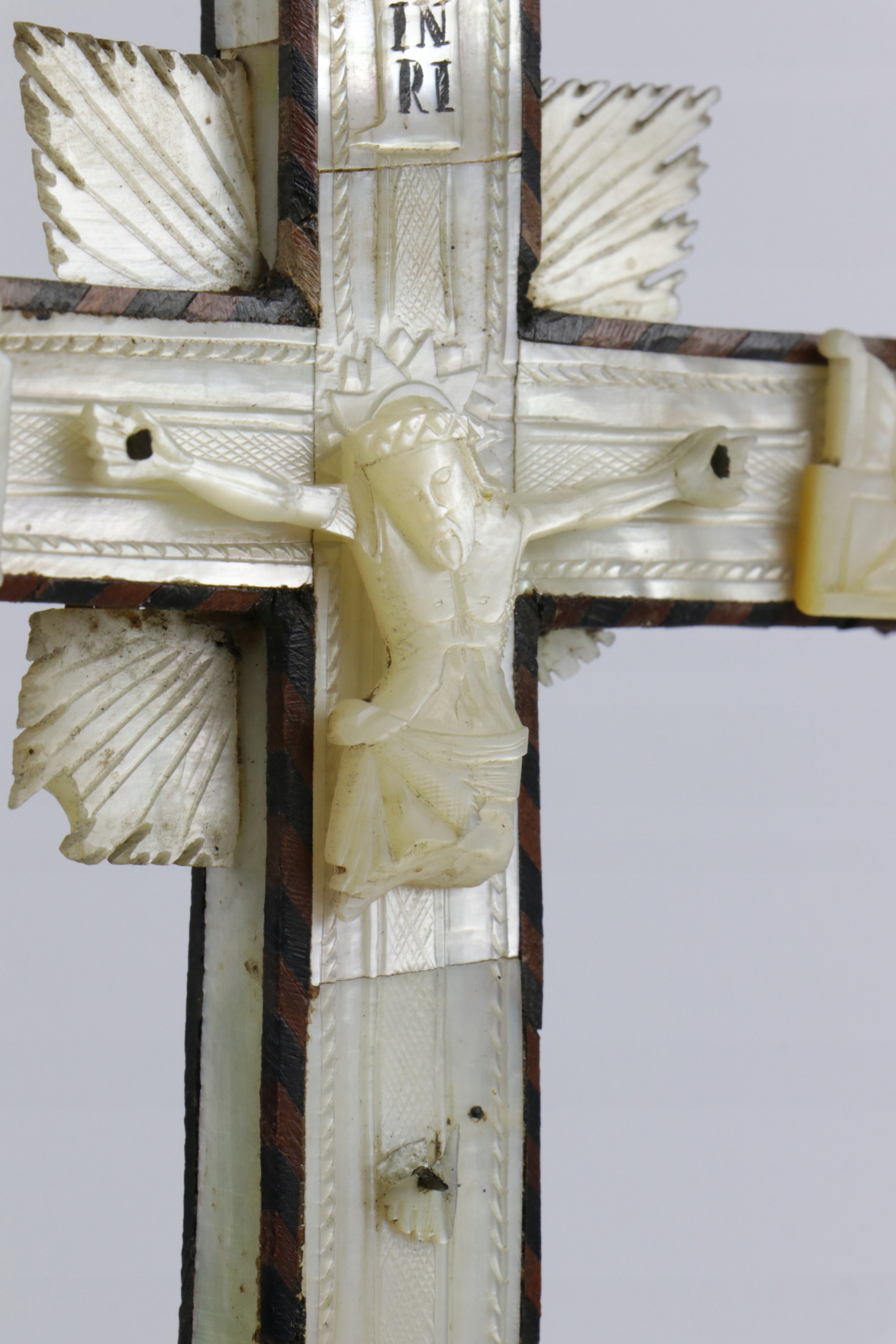 Старинное распятие из перламутра, перламутра и оливкового дерева. Основание в стиле барокко, в нижней части, под ногами Иисуса, фигура Марии. На оборотной стороне 14 отверстий, символизирующих 14 станций креста. В основании, в стилизованной тройной нише, расположена фигура Марии и, скорее всего, Петра и Павла. Филигранный орнамент выполнен очень красиво. В Интернете есть очень похожие распятия по происхождению, описанные как Святая Земля, Иерусалим, 18, 19 век.