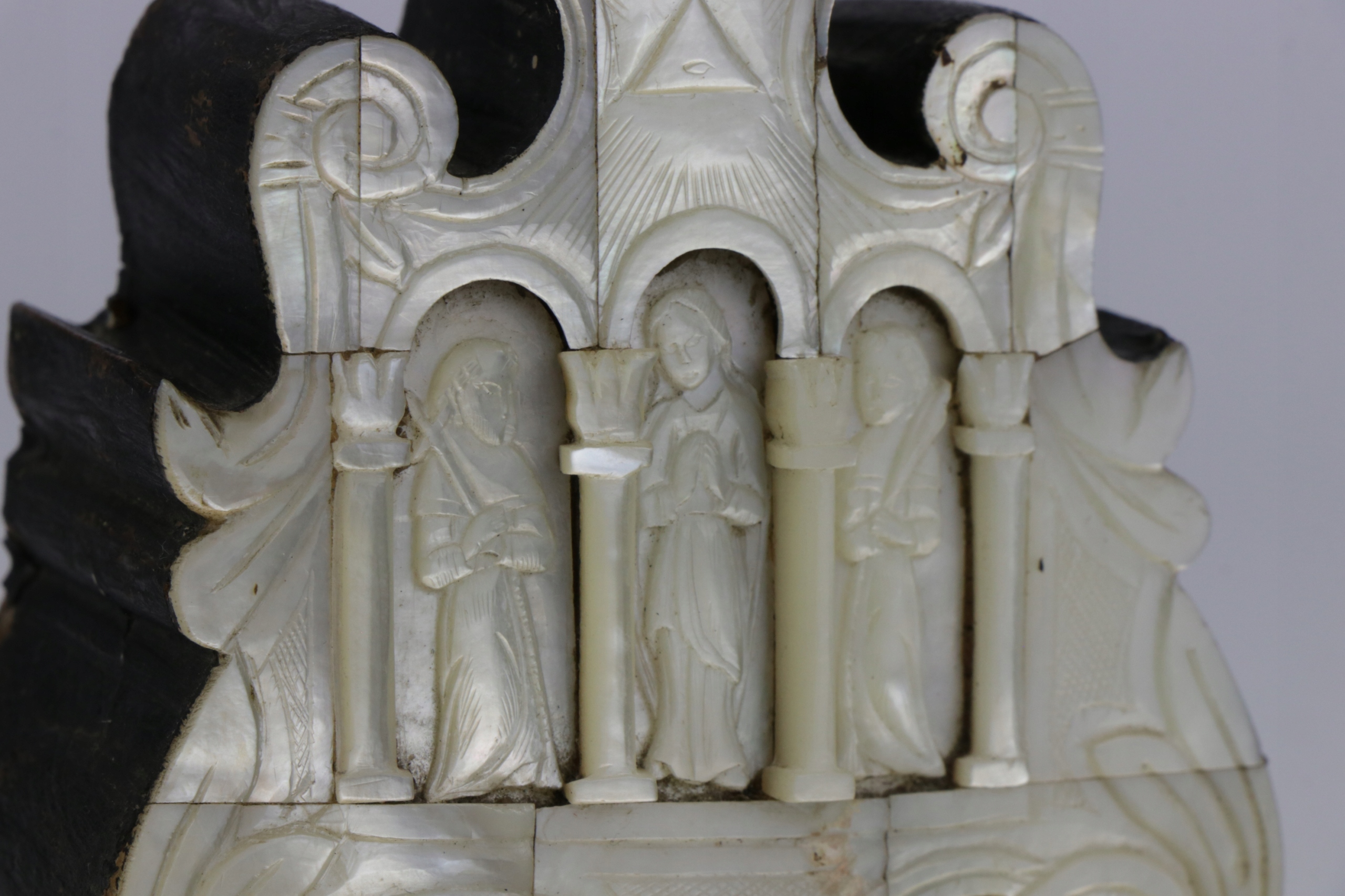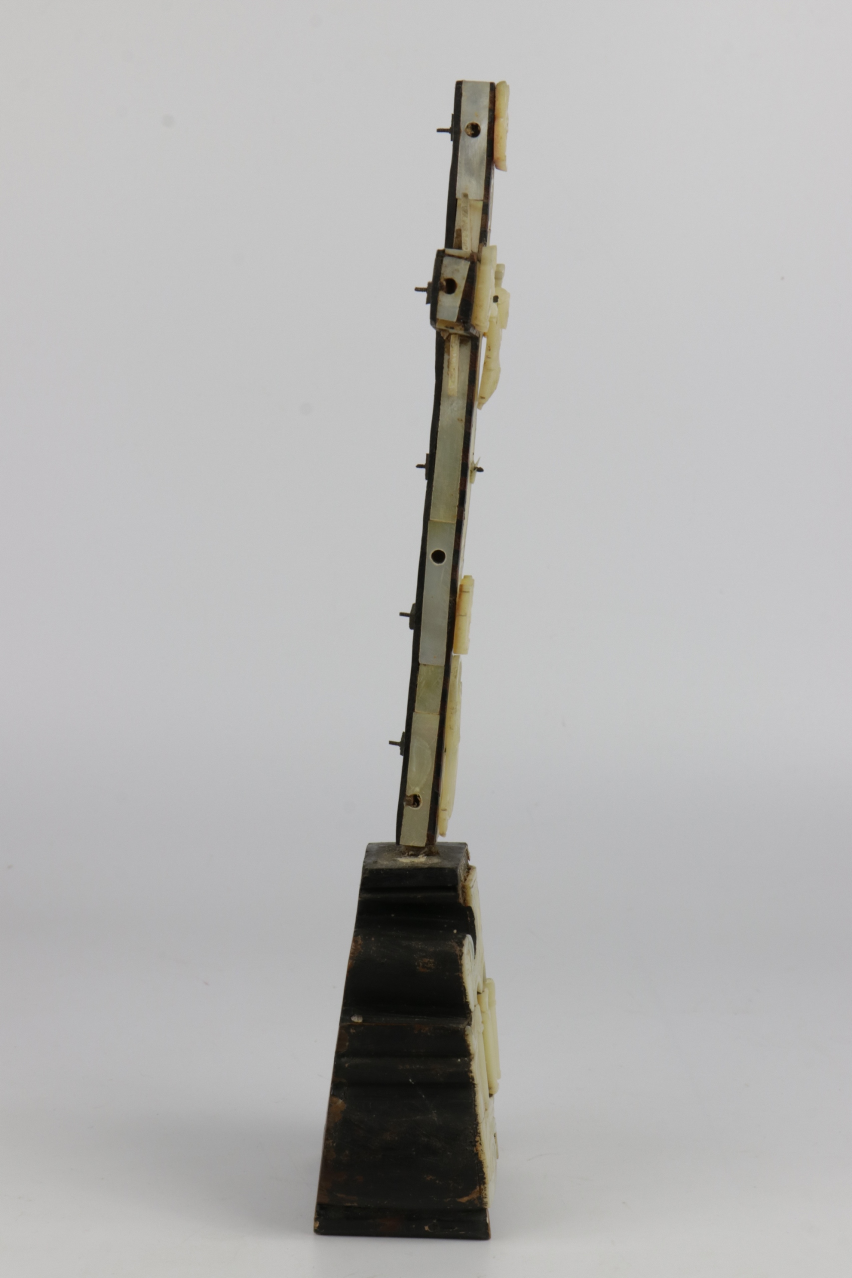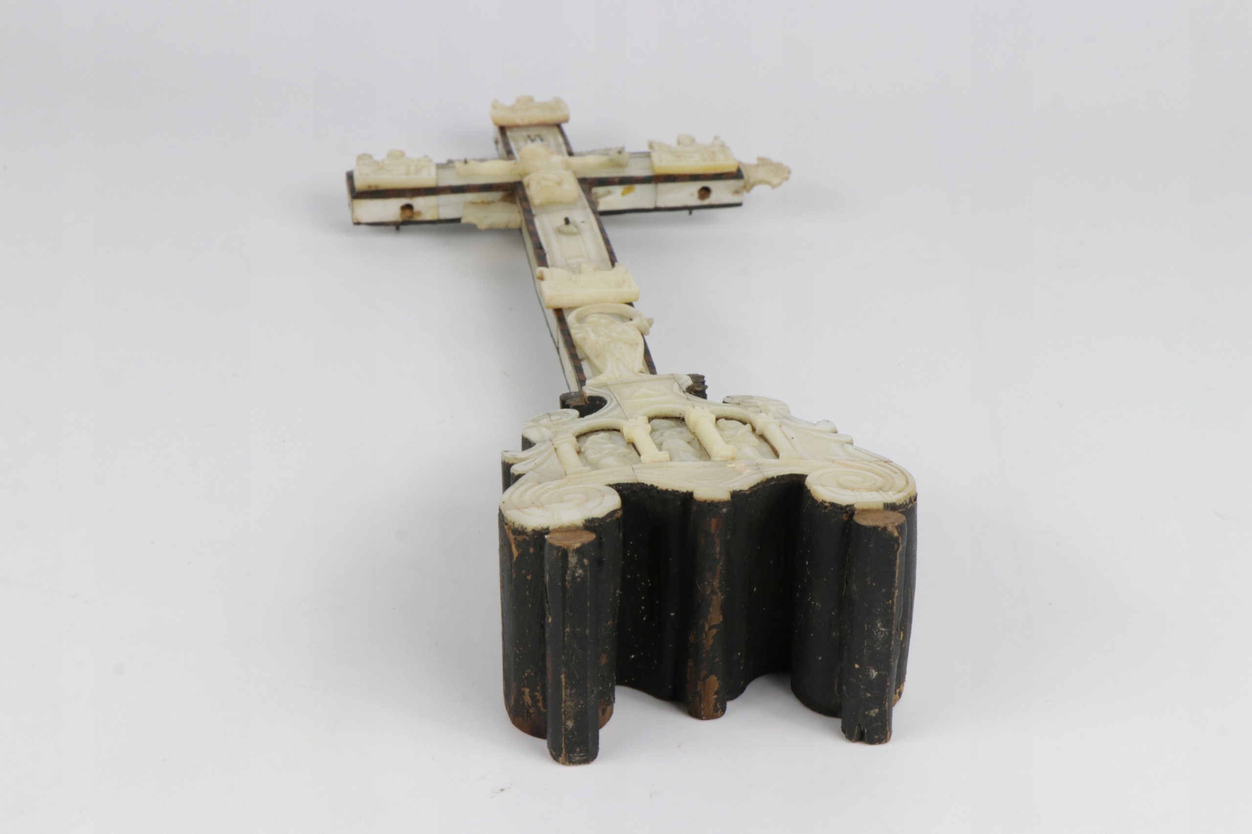 Старинное распятие из перламутра, перламутра и оливкового дерева. Основание в стиле барокко, в нижней части, под ногами Иисуса, фигура Марии. На оборотной стороне 14 отверстий, символизирующих 14 станций креста. В основании, в стилизованной тройной нише, расположена фигура Марии и, скорее всего, Петра и Павла. Филигранный орнамент выполнен очень красиво. В Интернете есть очень похожие распятия по происхождению, описанные как Святая Земля, Иерусалим, 18, 19 век.