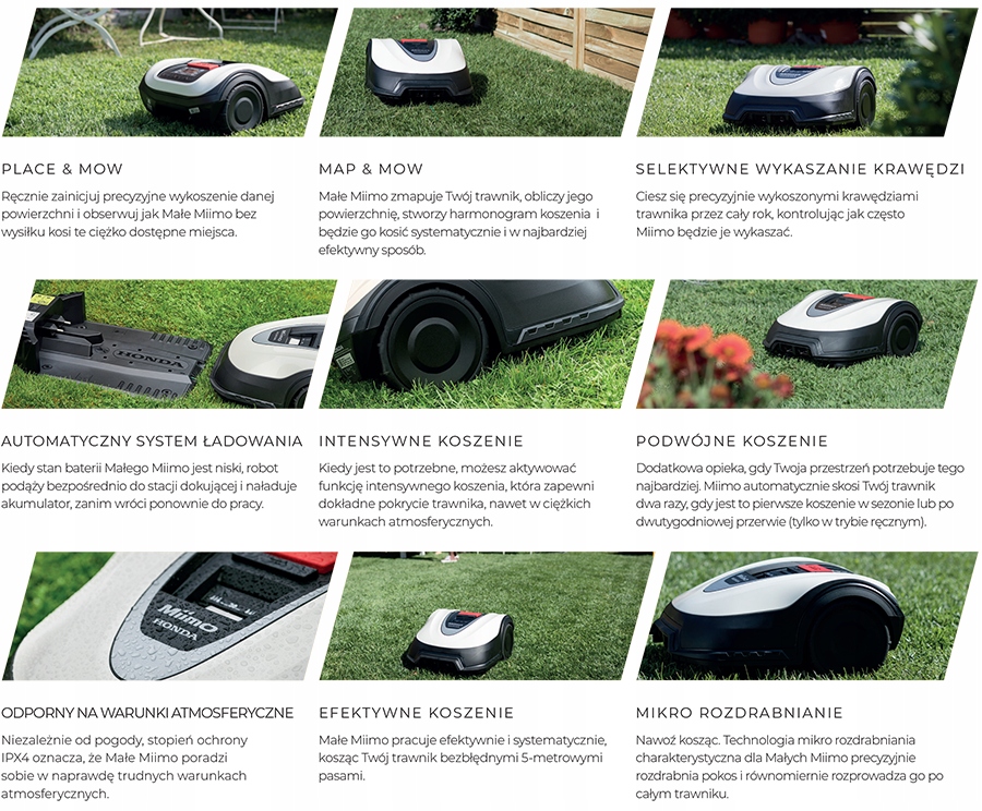 Роботы Honda Miimo из серии HRM 40/HRM 70 в основном современны. Благодаря использованию инновационного программного обеспечения сам робот сочетает в себе сад и полностью автономно адаптирует наиболее эффективный график работы. Маленькие миимо умны, мульчируют траву и логически кось - с параллельными ремнями. Рабочий цикл всегда начинается с скашивания краев, каждый раз, меняя направление косителя - чтобы не оставлять следы колес на газоне.